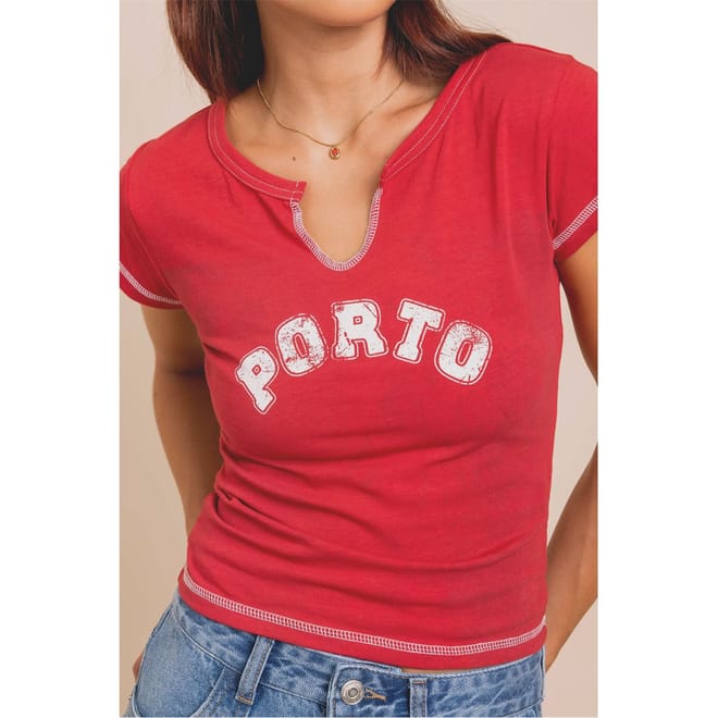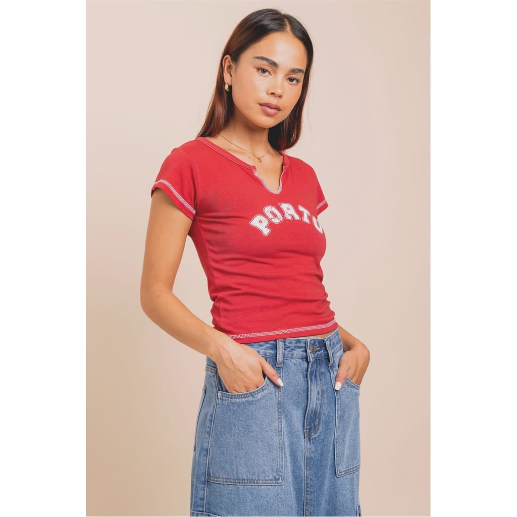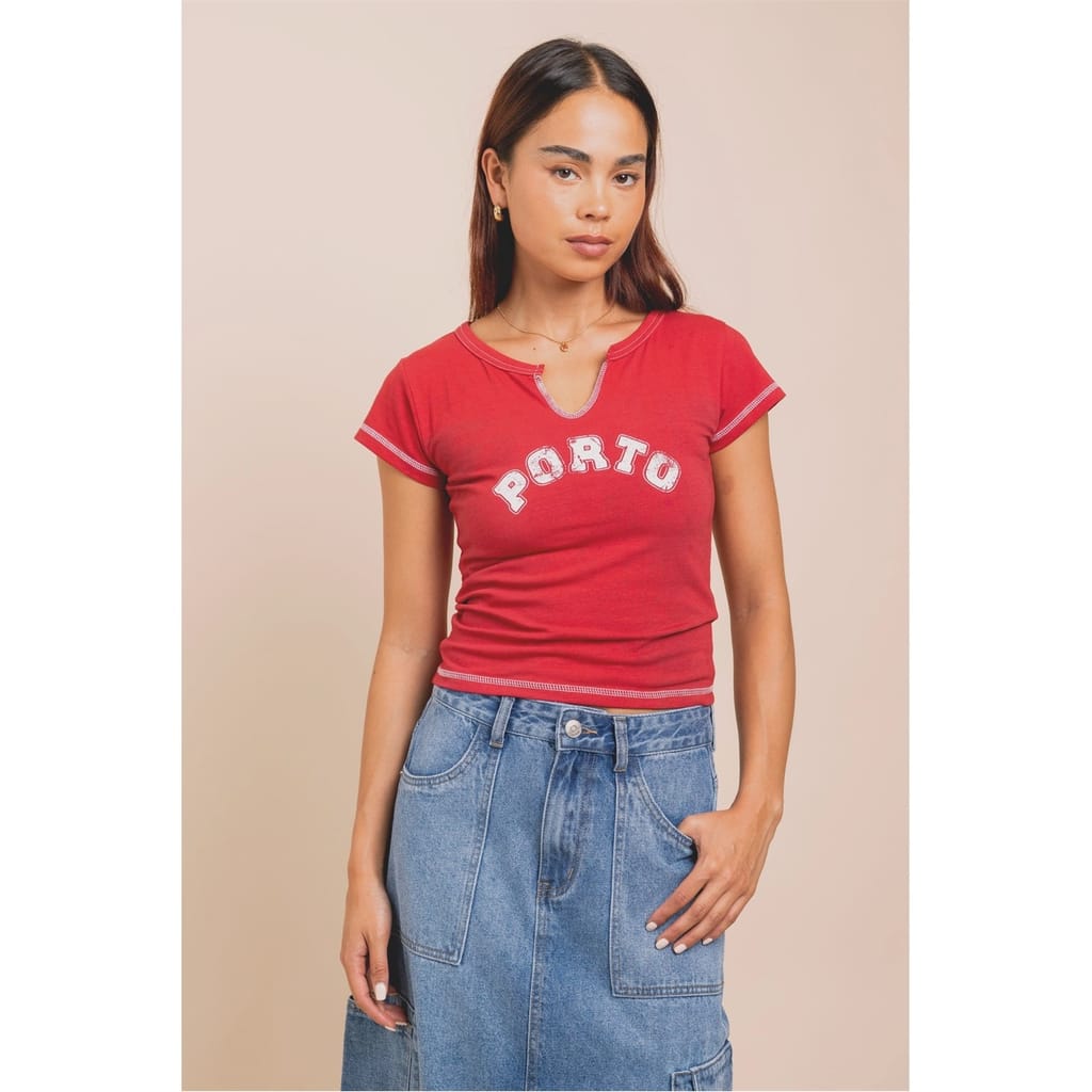 Discover this cropped t-shirt from Daisy Street. It features a notched neckline and short sleeves, providing a stylish look. This slim-fit top is designed with solid pattern and lettering graphic, making it a versatile addition to your wardrobe. -