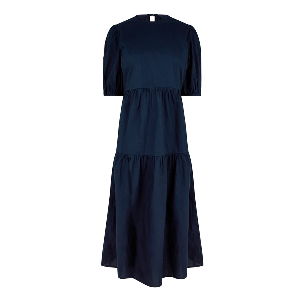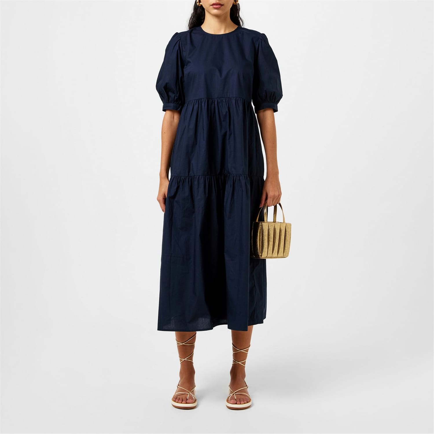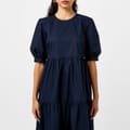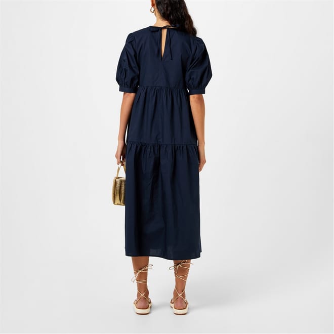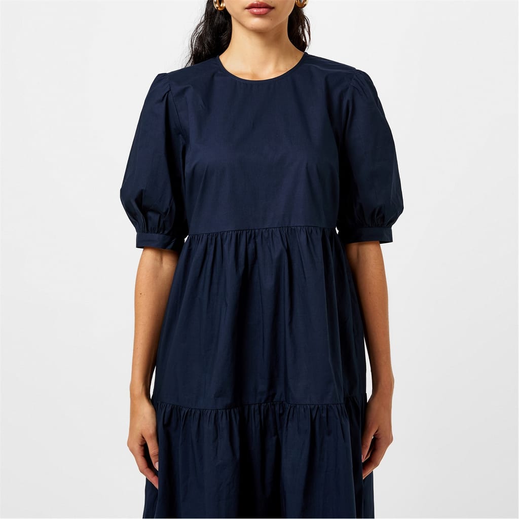 Discover the perfect children's midi dress from Nobody Child. This dress features a classic crew neckline, short puff sleeves, and a straight hemline. The solid pattern and smocked embellishments add a touch of elegance, making it an ideal choice for any occasion. -