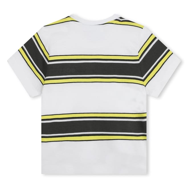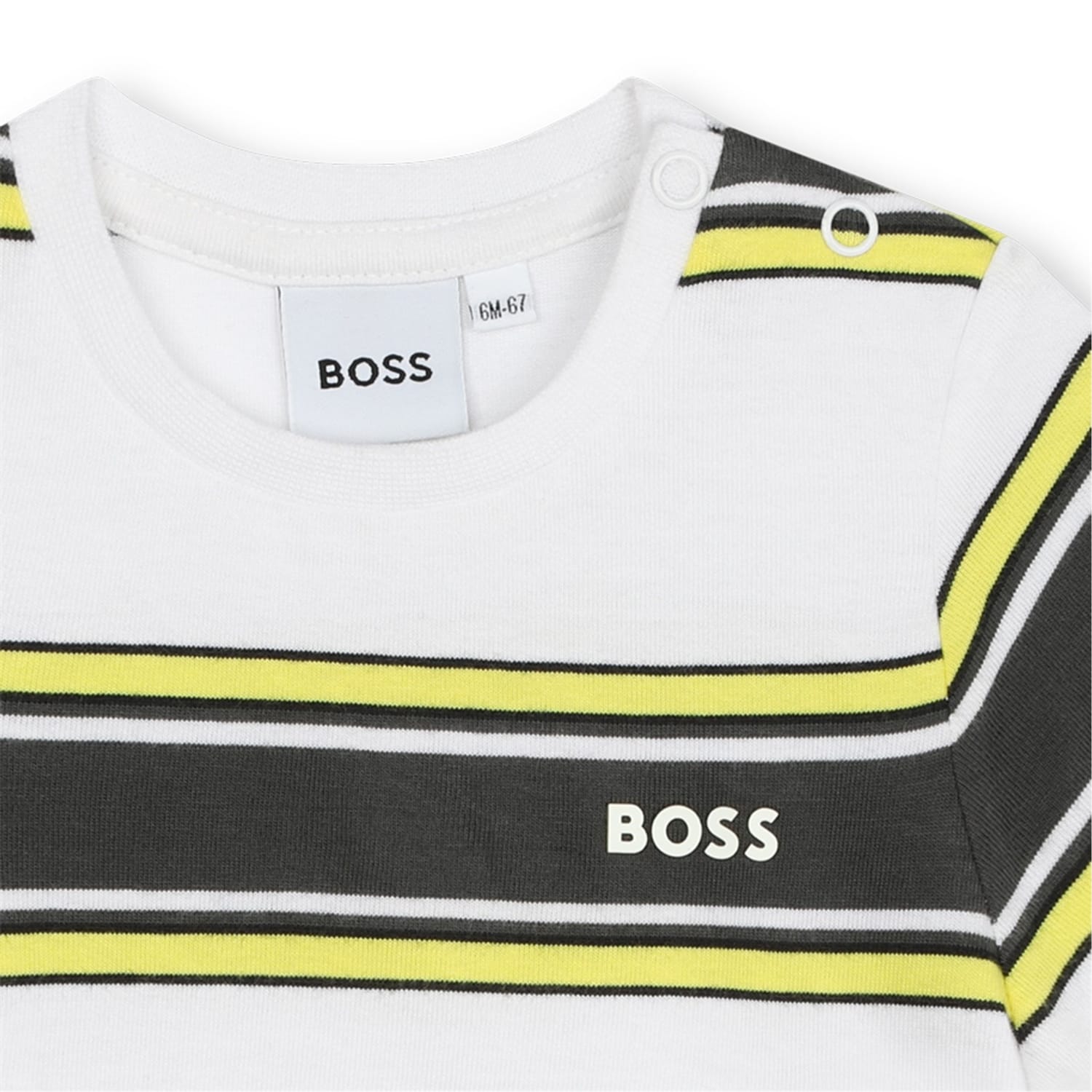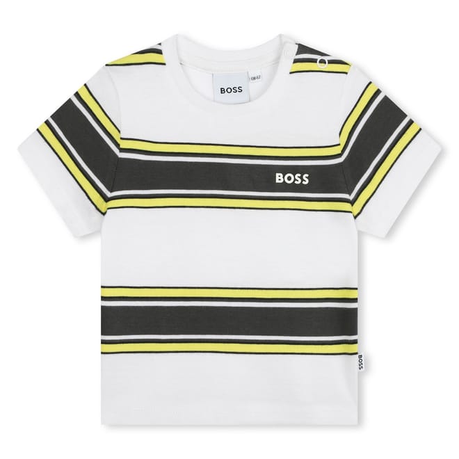 This Boss t-shirt is perfect for casual wear. Featuring a regular fit and short sleeves, it ensures comfort and style. The crew neck design complements the horizontal stripe pattern, adding a classic touch. The logo embellishment subtly showcases the brand's identity. -