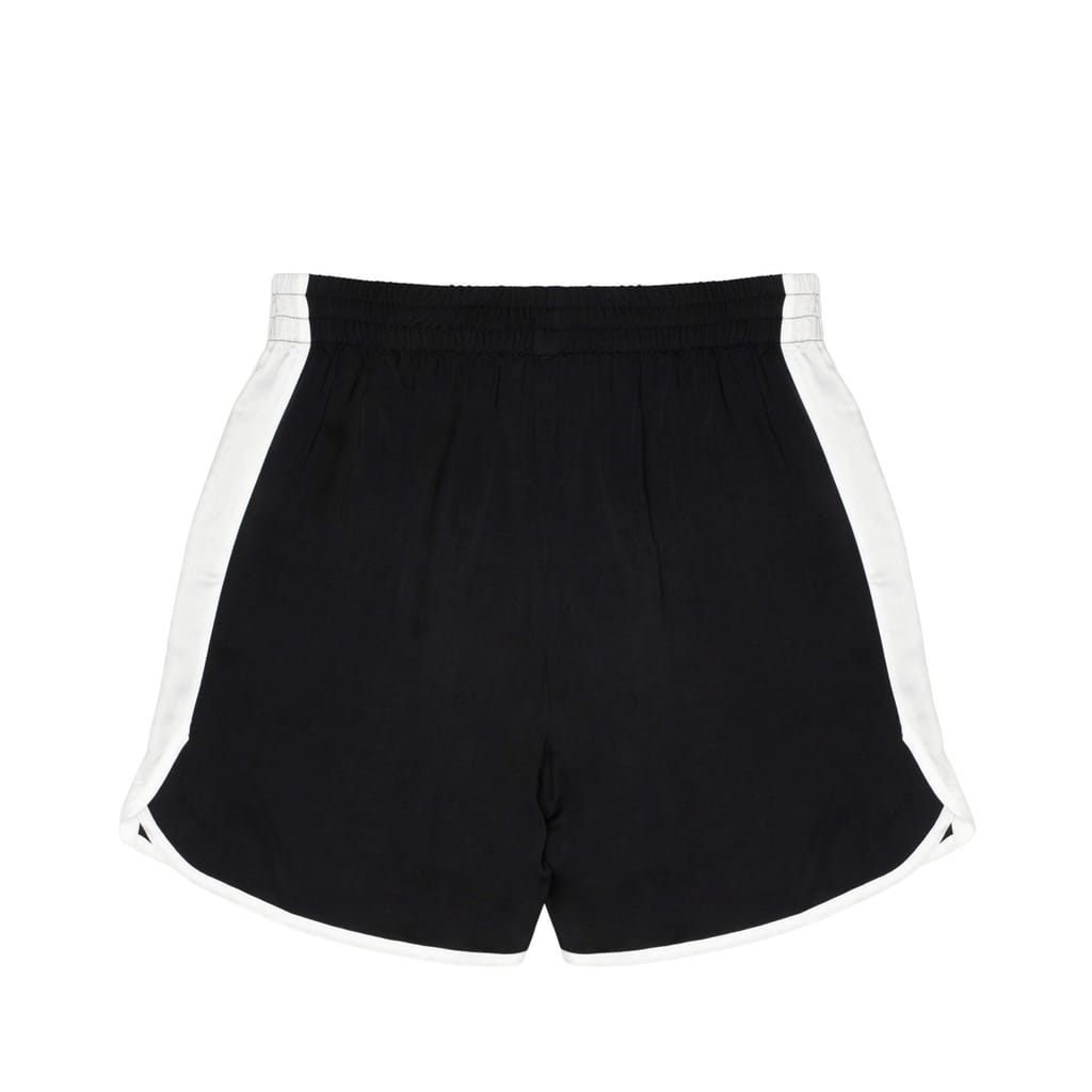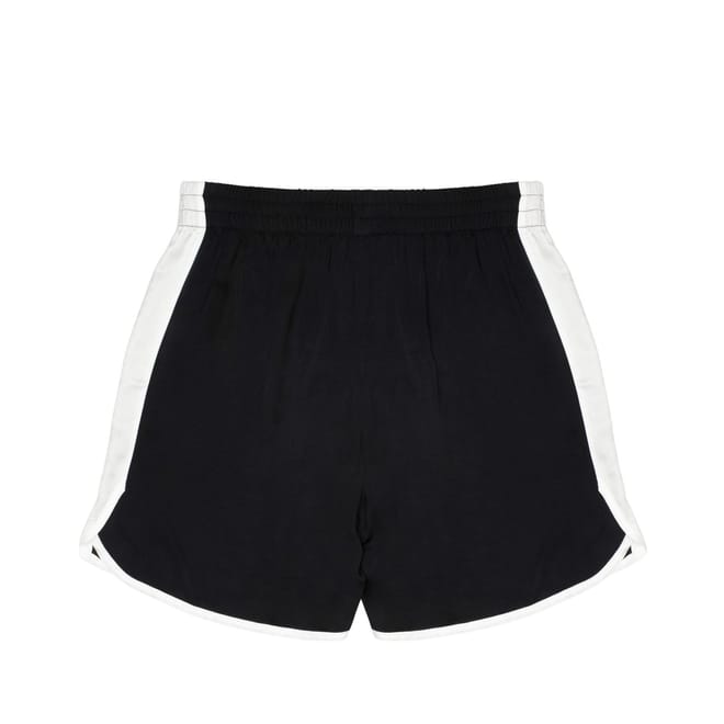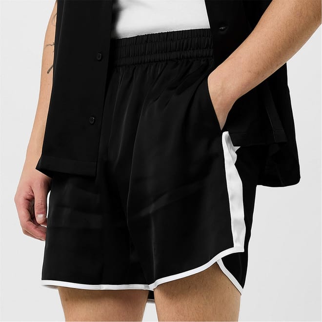 - Crafted from the finest viscose with a lustrous satin finish, these shorts offer a regal allure that sets them apart. The regular fit and mid-rise design ensure a comfortable and flattering fit for any discerning individual. The elasticated waistband with concealed drawstring fastening adds a touch of practicality without compromising on style. With a thigh-length silhouette and a longer back hem, these shorts exude a sense of effortless sophistication. The two side slip pockets provide a functional touch, allowing for easy storage of small essentials. The piped-trim detailing, adorned with a side stripe detail, adds a subtle touch of drama and elevates the overall aesthetic.