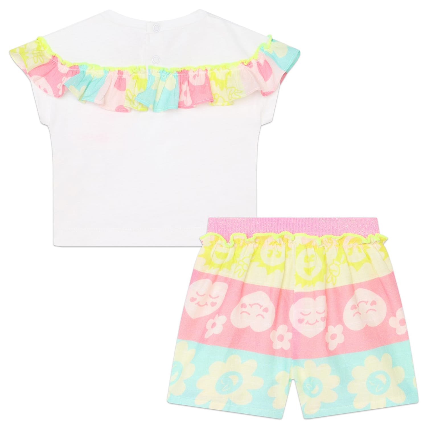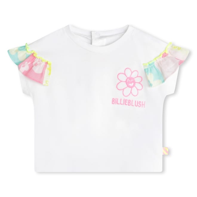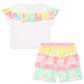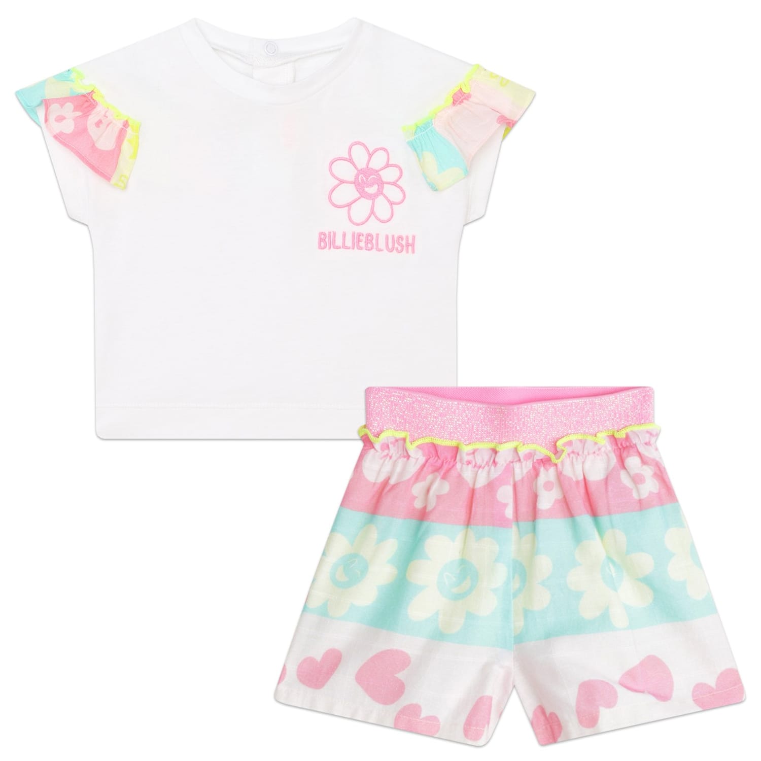 This Billieblush top short set features a casual style with a floral pattern. The t-shirt has a crew neck and short ruffle sleeves, adding a playful touch. The set includes bermuda shorts, perfect for a relaxed look. Embellished with a logo and ruffles, this ensemble combines comfort and style effortlessly. -