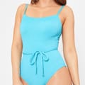 Crafted from a chic textured crinkle fabric, this swimsuit exudes modern style. It has a flattering square neckline and adjustable straps for the perfect fit, while the added stretch gaurentees all-day comfort. Sewn in padded cups provide support and the removable belt adds versatlility to your beach look. -