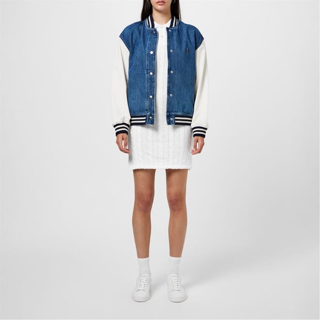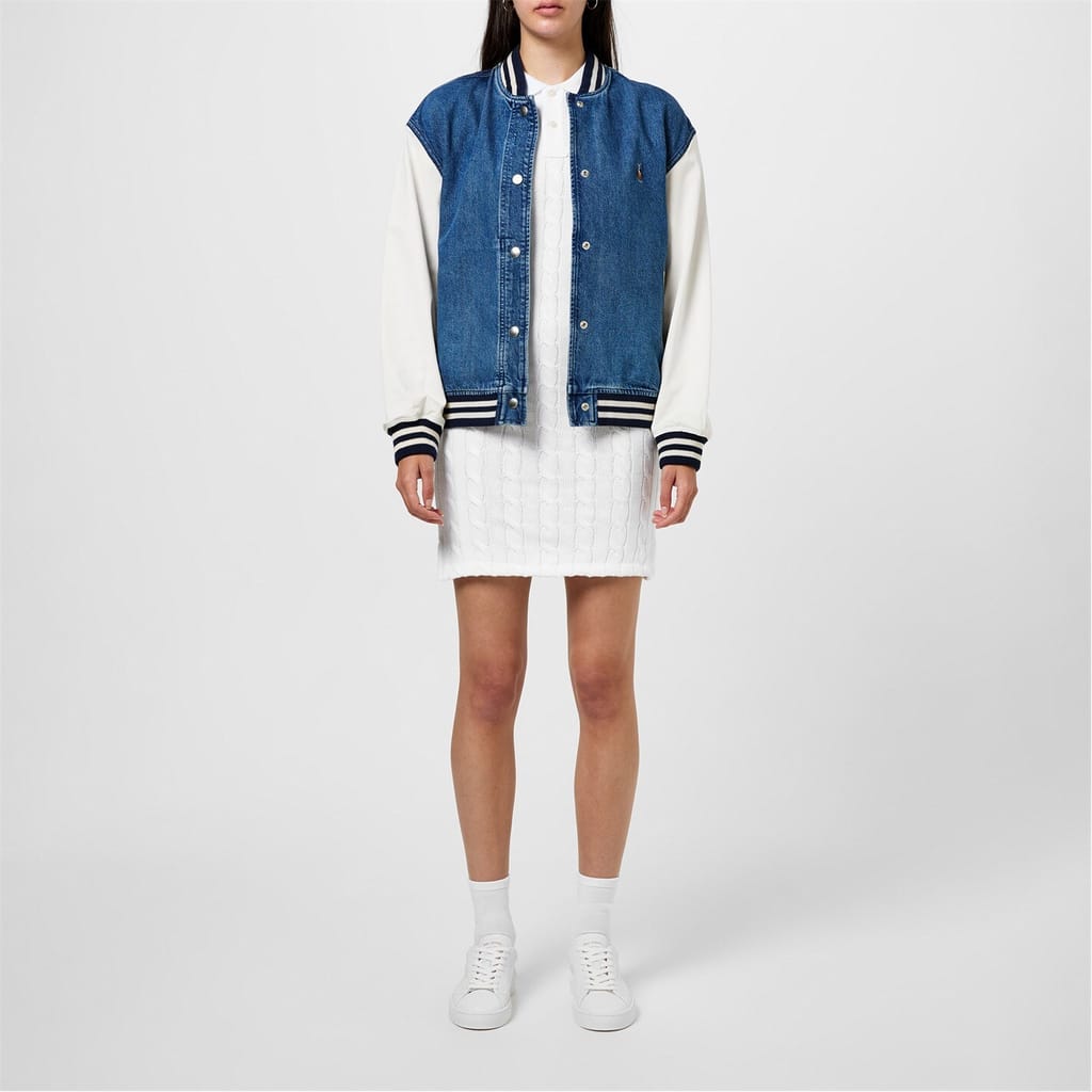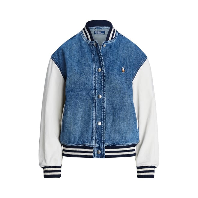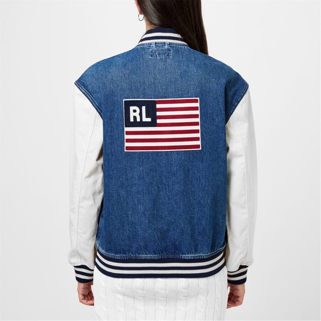 - With a pressed stud fastening, this jacket offers functionality and style in equal measure. The relaxed fit, stand collar, and dropped shoulders tantalize the senses, exuding an aura of casual luxury. The contrast long sleeves, brand embroidery at the chest, jet pockets at sides, ribbed knit trims, and applique brand graphic at the back depict the brand's commitment to impeccable detailing and a harmonious blend of contrasting elements. Perfect for an upscale casual event or an exclusive dinner gathering, the Polo Ralph Lauren Denim Bomber Jacket is an essential item to add to your collection.
