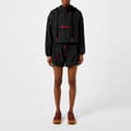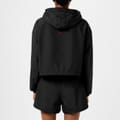- Crafted from high-quality nylon, this lightweight windbreaker boasts a regular cropped fit with dropped shoulders, exuding a relaxed yet refined appeal whilst allowing flexible movement. The stand collar and hooded design, with a chunky drawstring fastening, add modern sophistication, while the quarter zip fastening with a branded pull tab ensures both style and functionality.