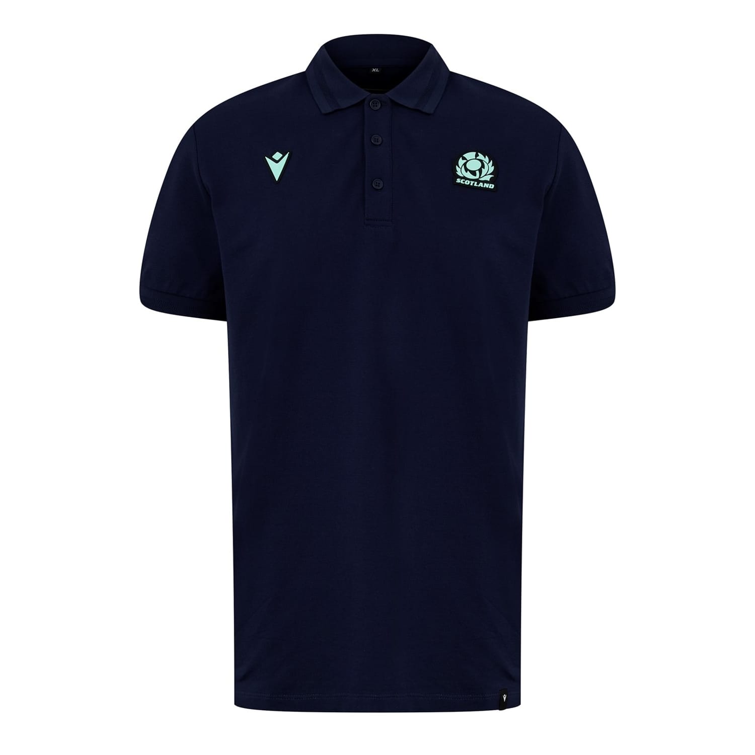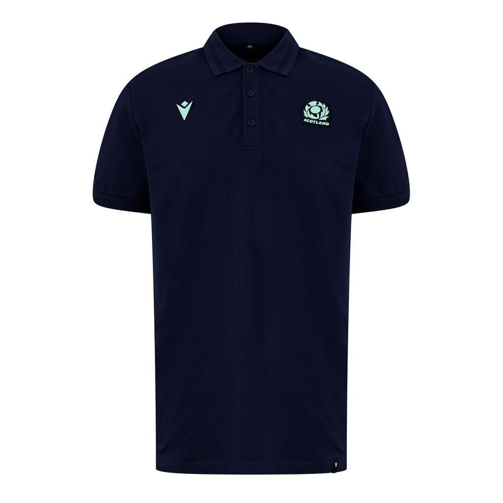 - Featuring short sleeves, a fold over collar and a two-button placket, the sleek navy colourway adds a sophisticated appearance to the rest of your ensemble. Accented with teal detailing on the sleeves and at the torso, the polo shirt also comes with tonal patterned sleeves. Complete with the team badge and Macron branding at the chest along with the Scotland flag embroidered to the back. Whether you're attending a game to watch from the stands or are about to head out for a drink with friends, the Macron Scotland Rugby Union Polo Shirt 2024 2025 will be your trusted companion.