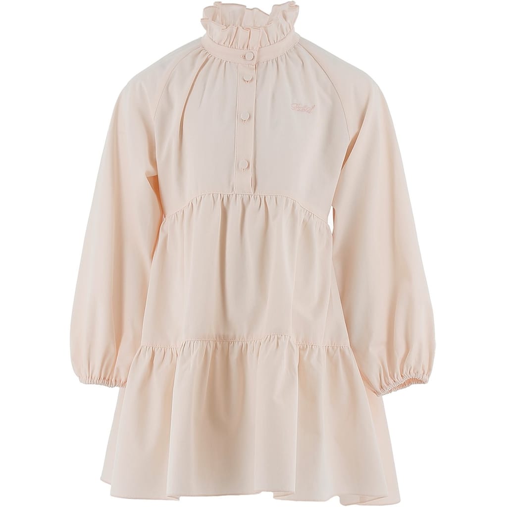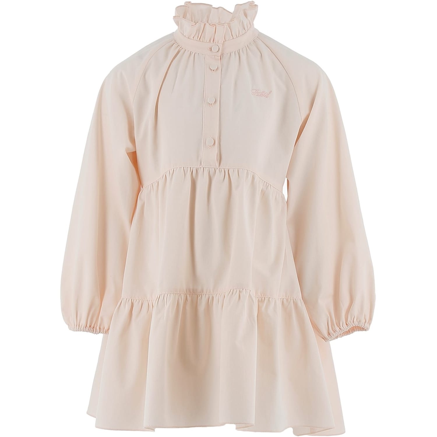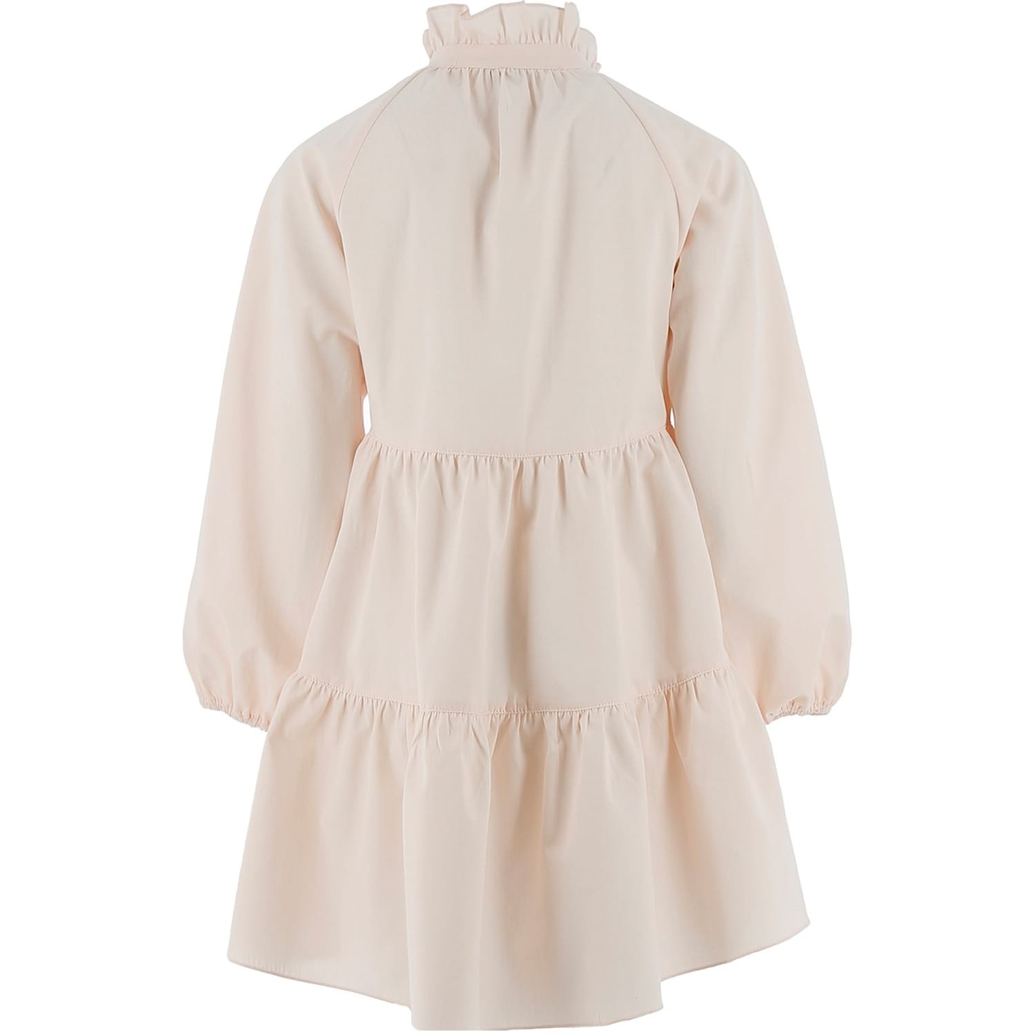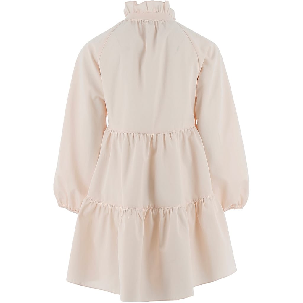 This Philosophy mini dress features a high collar and high neck, offering a sophisticated look. The solid pattern and a-line style create a timeless silhouette, while the long raglan sleeves add a touch of elegance. Embellished with smocked details and a logo, it has a straight hem and button closure, making it a chic choice for any occasion. -