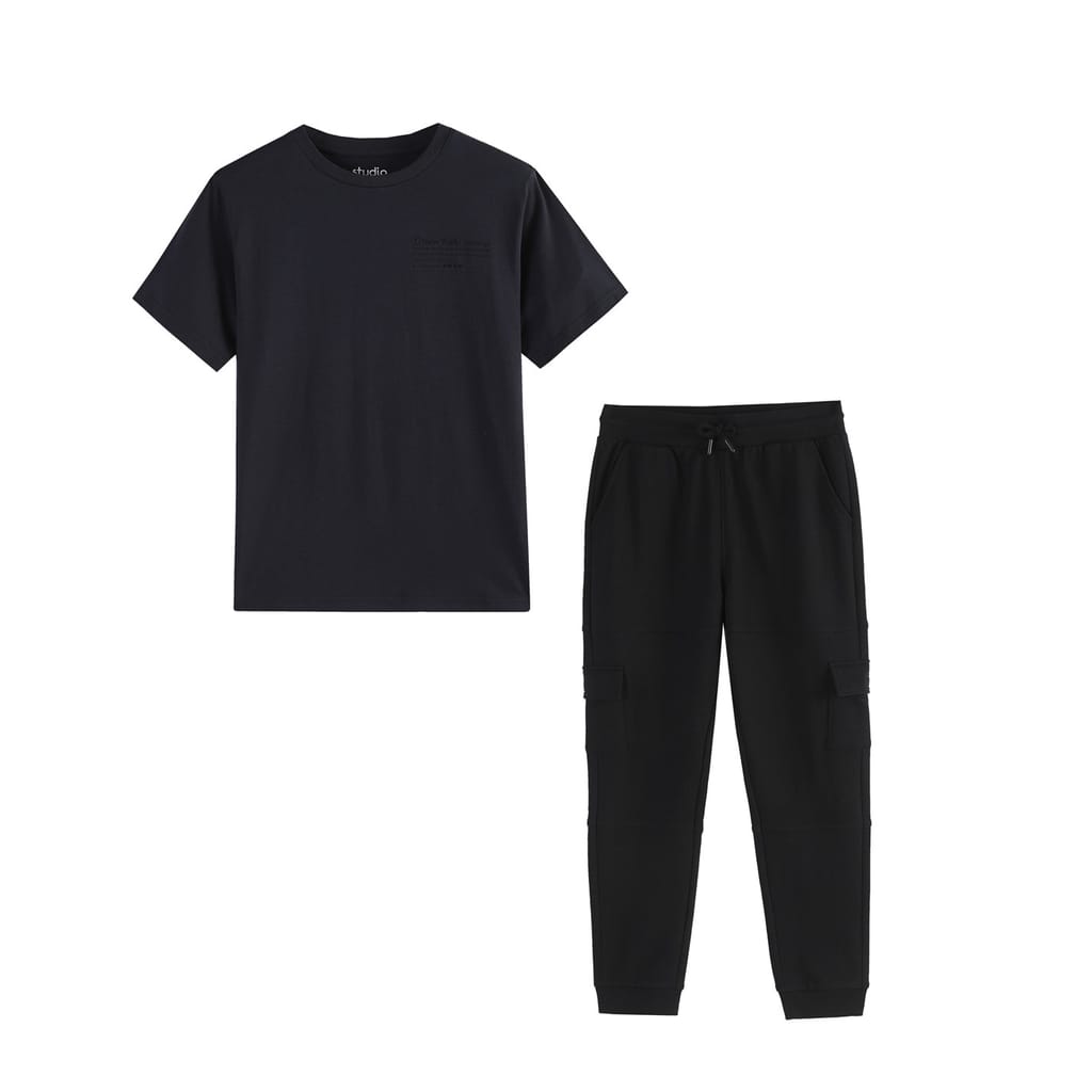 Discover the Studio top and jogger set, perfect for casual wear. This set features a crew neck top with short plain sleeves, adorned with a graphic print and lettering. The joggers complement the look, making it ideal for relaxed outings. The set is completed with a subtle logo embellishment, adding a touch of brand identity. -