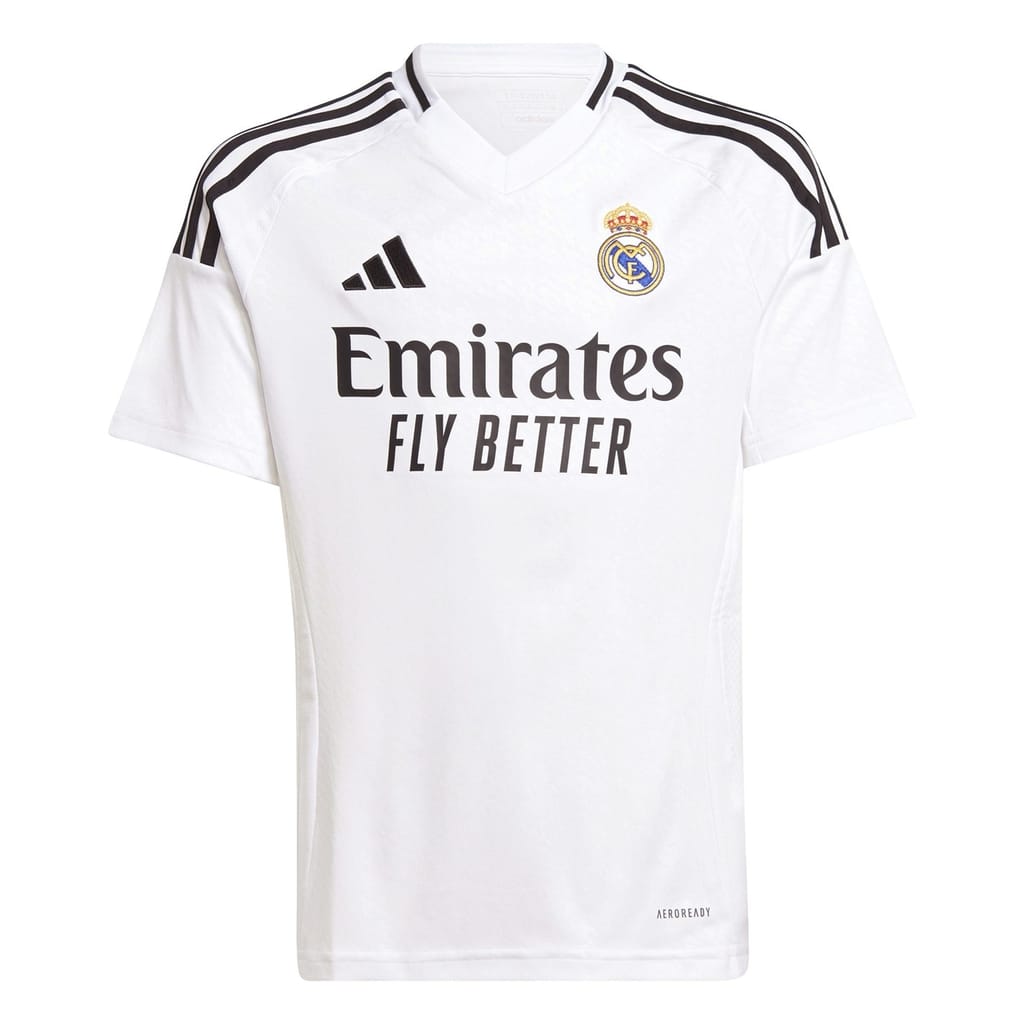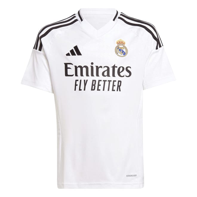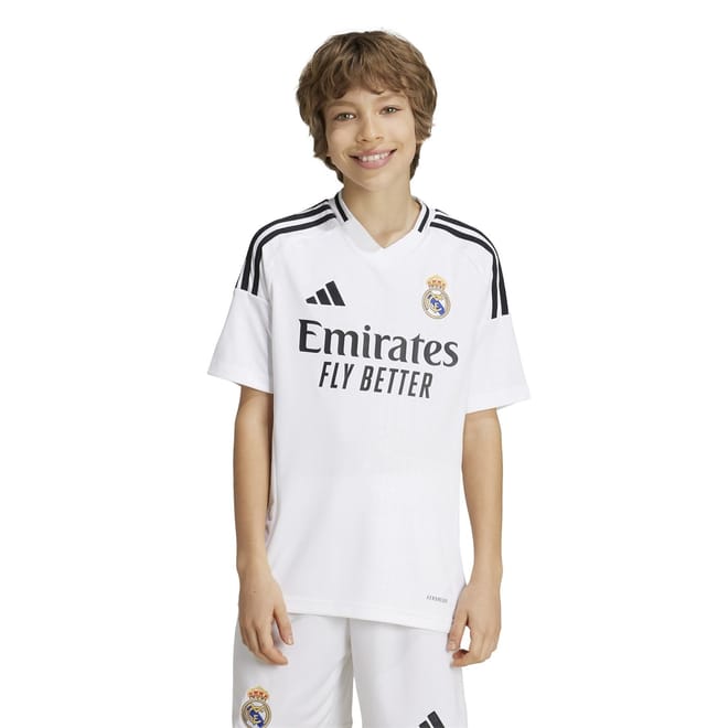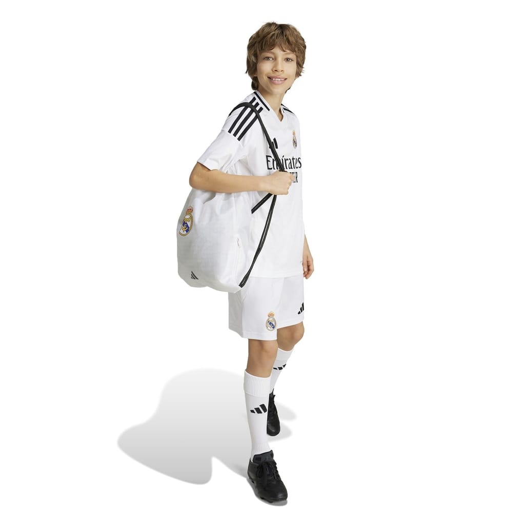 Allow your child to make a bold statement of their team loyalty with the adidas Real Madrid Home Shirt 2024 2025, a celebration of the long-held traditions of the club's infamous city. Made just for young football fanatics, this kid's shirt is crafted with recycled polyester, combining style with sustainability. Keeping them cool and comfortable even during intense moments, the moisture-managing AEROREADY technology effortlessly wicks away sweat, while the side mesh inserts ensure maximum breathability at all times. Framed with a v-neckline and short sleeves, the jersey offers maximum freedom of movement while maintaining its signature sporty style.