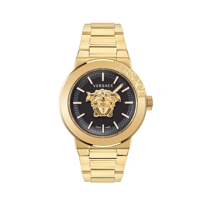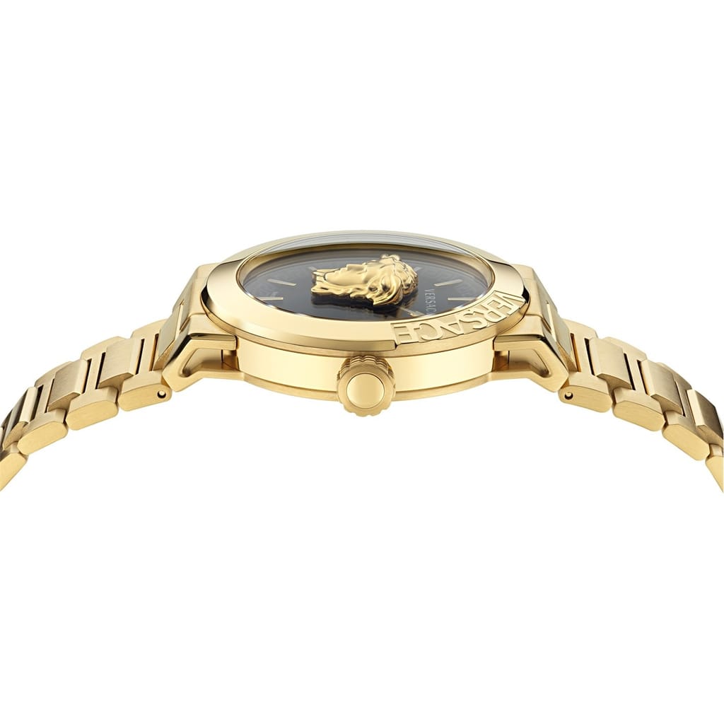 A cool and trendy Versace slim & modern 36 mm case. The Greca decorates the inner ring while the dial seems a beautiful flowerinA new shaped case for a timepiece that celebrates the beauty and the charm of the Medusa floating on dial. Featuring an iconic design, this classic watch has a three-dimensional Medusa on the guilloche dial. The top ring is further decorated with the Grecag garden. This high catching watch is a perfect accessory for young generations that want to show their love for the Versace bra to strengthen the connection with Versaces DNA.nd. The collection features or a leather strap version with the Medusa head decoration at 12h and a stud at 6h or a fashionable mesh band. -