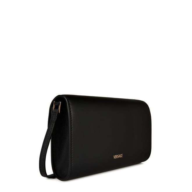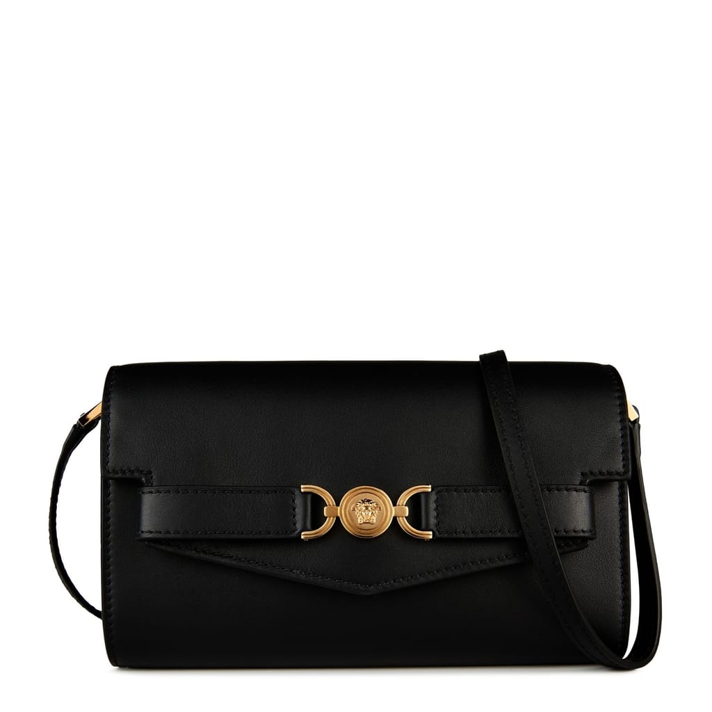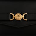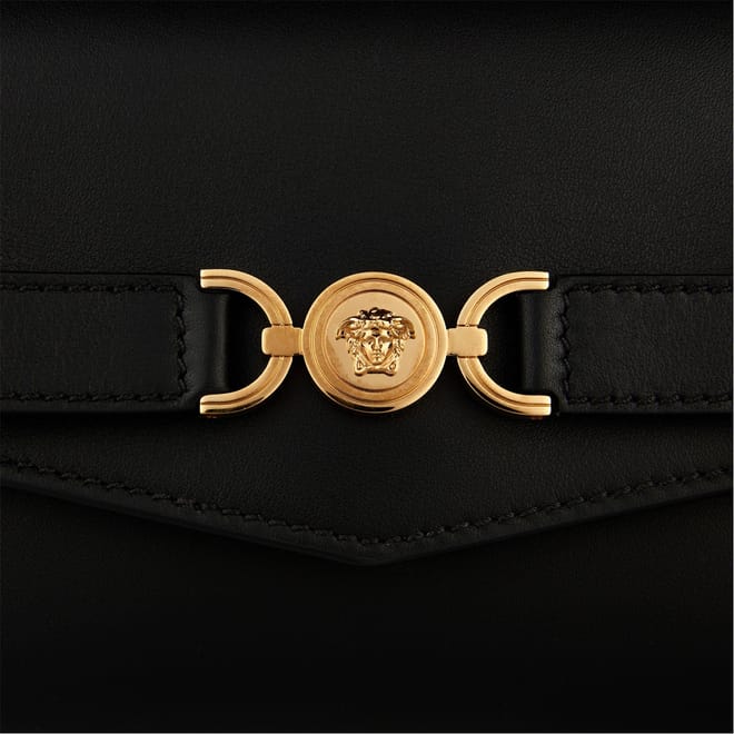 - Crafted from luxurious calf leather with a sumptuous lambskin lining, this mini bag is created with the finest materials. Designed to cater to the discerning needs of the modern luxury consumer, the Medusa Mini Bag comes with a detachable and adjustable leather shoulder strap, allowing you to personalise your carrying style. Its foldover flap features a magnetic snap button closure, ensuring your belongings are secured while adding a touch of convenience to your daily life. Inside, you'll find an internal slip compartment, providing a designated space to organise your small essentials. Adorned with intricate gold metal stud detailing, the bag showcases the attention to detail that Versace is renowned for. The gold-tone Medusa hardware strap detail on the front adds a captivating focal point alongside the logo lettering embossed to the rear as a symbol of authenticity and quality. Designed to elevate your evening attire, the Medusa Mini Bag effortlessly transitions from a shoulder bag to a clutch, offering versatility for various occasions. Whether attending an event or a romantic dinner, this mini bag is the perfect companion to enhance your ensemble and make a lasting impression.