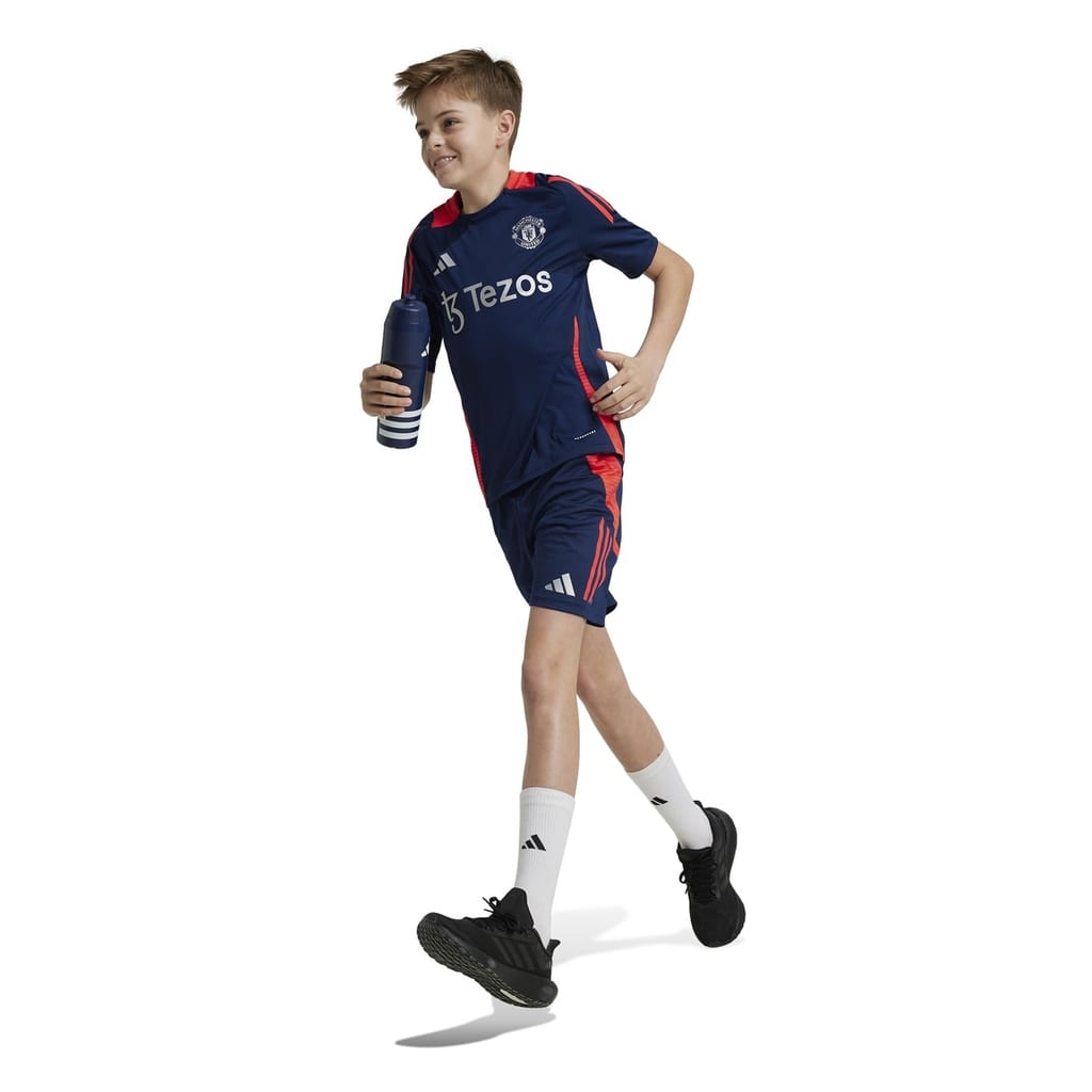 - With a striking main blue colour, complemented by vibrant red and silver accents, this shirt captures attention wherever it goes. The three-stripe detail on the shoulders pays homage to adidas' iconic design, while the team crest and legendary three-stripe logo proudly grace the chest. Whether training or supporting their team from the sidelines, the adidas Manchester United Training Shirt 2024/25 is the perfect com -