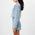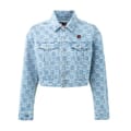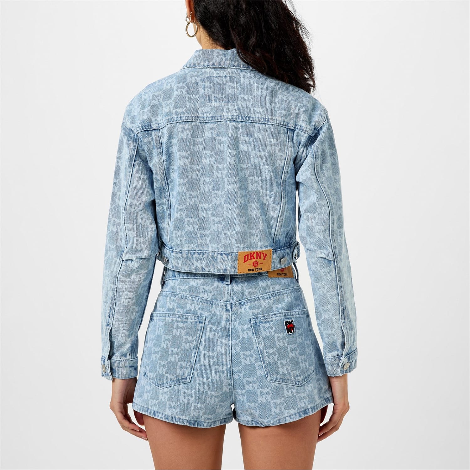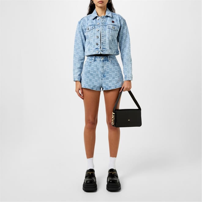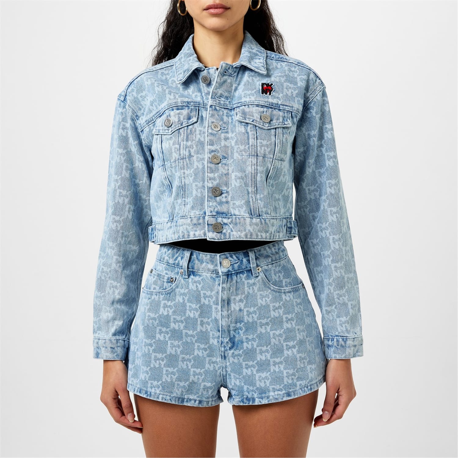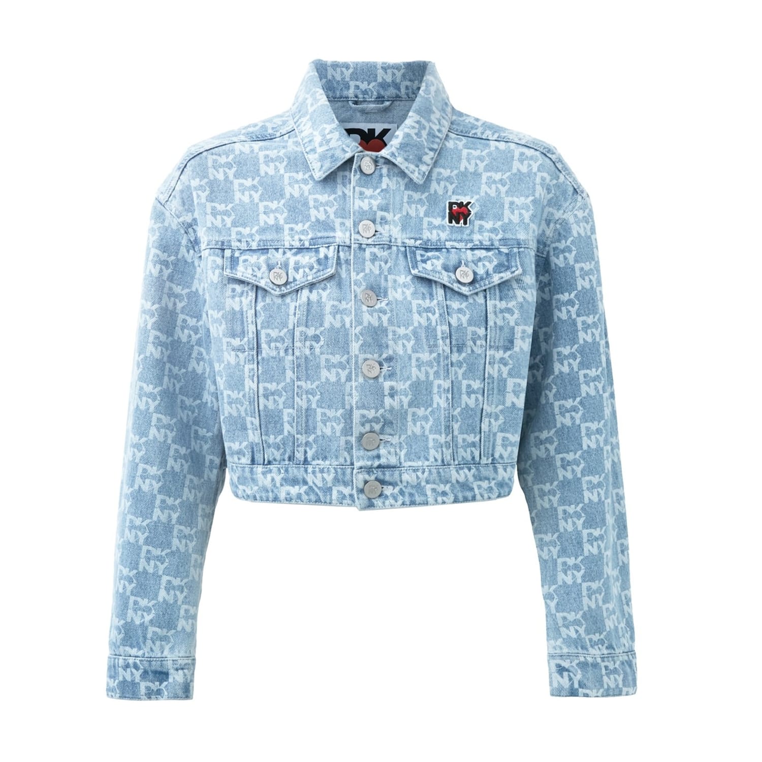 This DKNY top features a striking all-over logo pattern and long sleeves. Designed with a button closure, it offers a relaxed fit for comfortable everyday wear. The short length adds a modern touch to this versatile piece. -