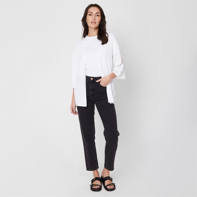 The Be You cardigan sweater is a versatile addition to your wardrobe. Featuring three-quarter sleeves and lace detail embellishments, this solid, relaxed fit top is ideal for various occasions. Crafted for comfort and style, it embodies a timeless elegance. -