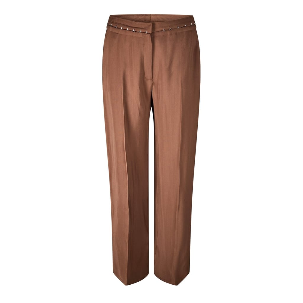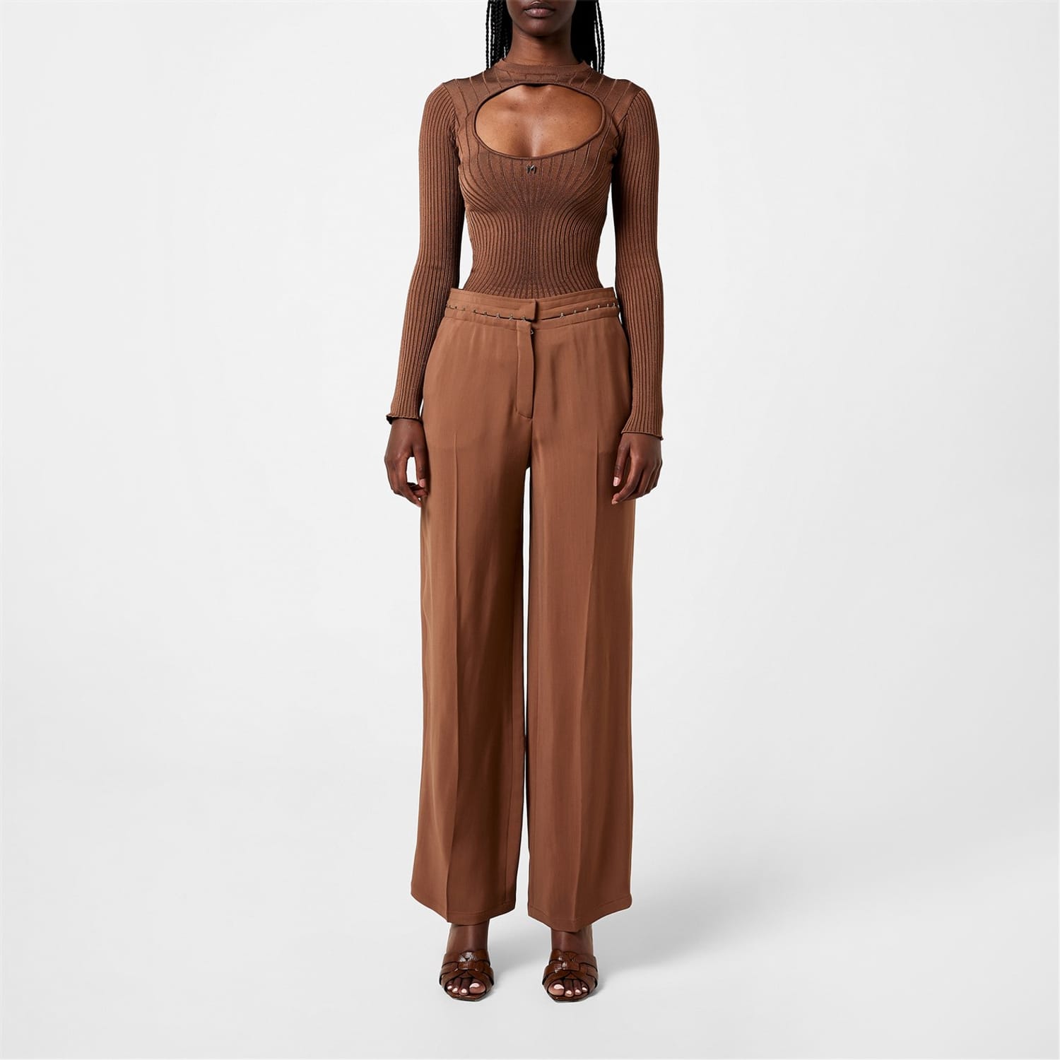 Placing a unique twist on traditional tailoring, the Hook & Eye Wide Leg Trousers epitomise the avant-garde aesthetic of the house of Mugler. Crafted from a luxurious premium viscose blend, these trousers boast a striking silhouette that speaks to the strong power dressing vision of many of Mugler's designs. Impeccably tailored, these high-waisted trousers boast a straight loose fit that effortlessly flatters the silhouette. The hook closure which encircles the waist, provides a hyper-feminine touch, reminiscent of corsetry, to these otherwise masculine-inspired pants.