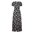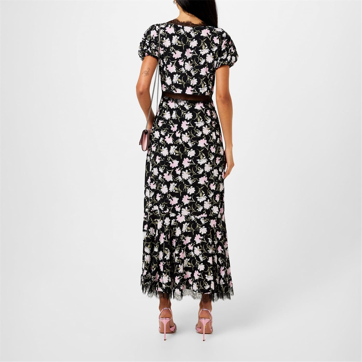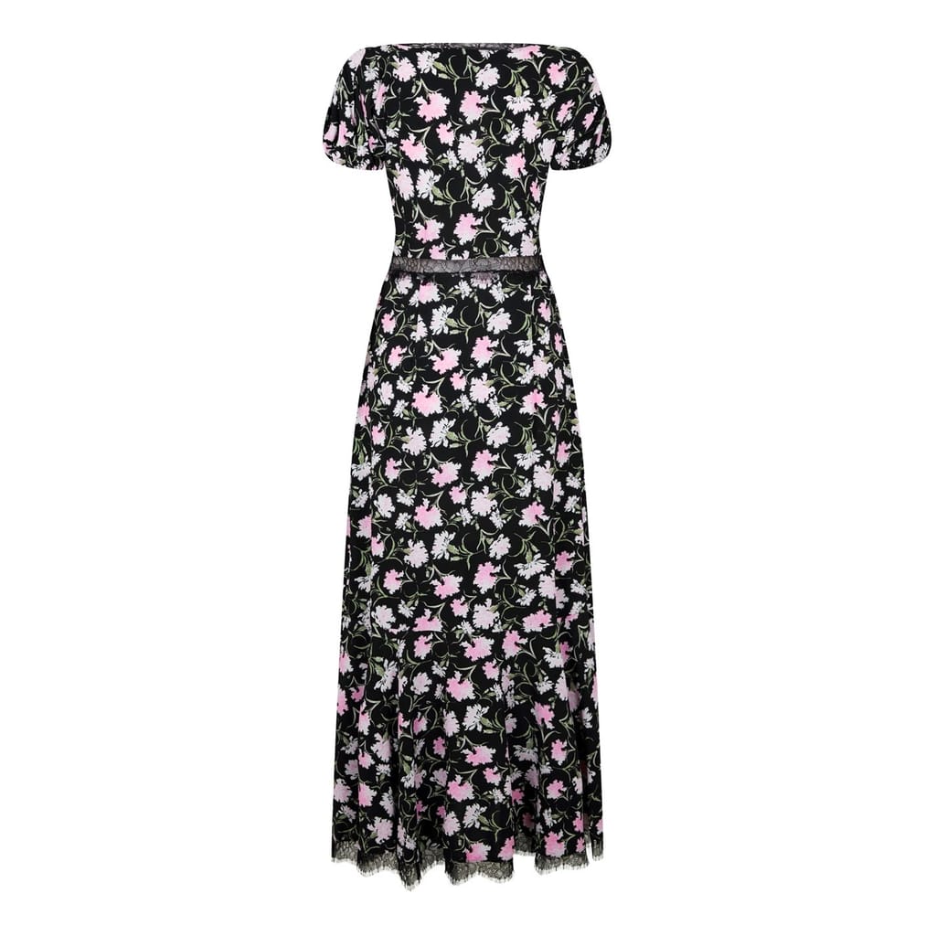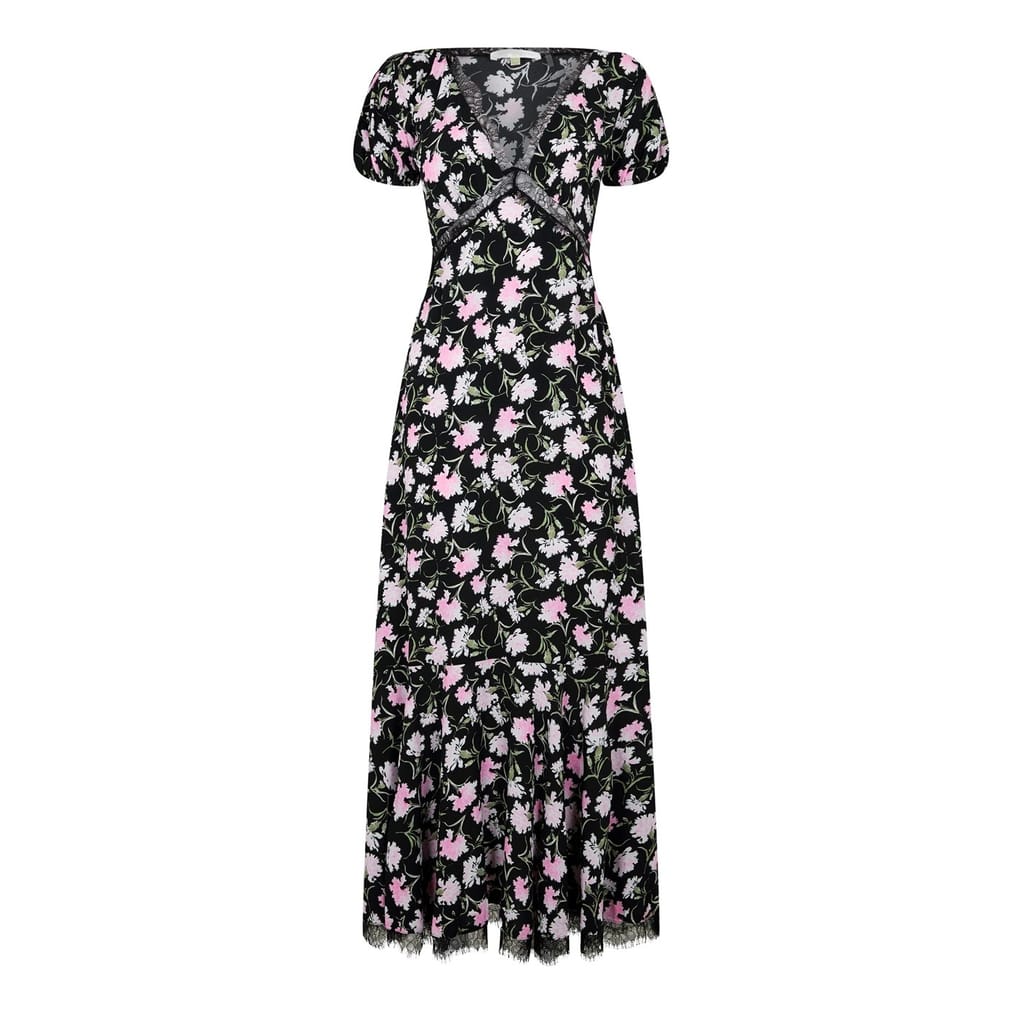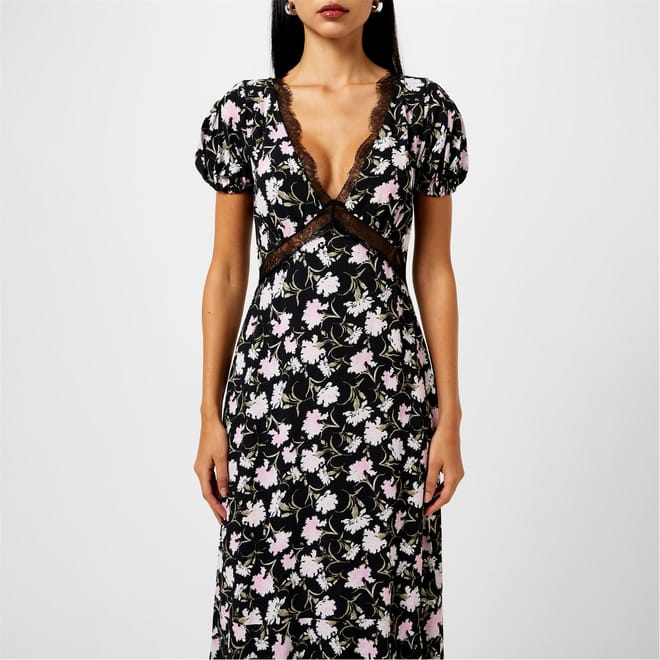 This Love Shack Fancy midi dress features a charming floral pattern and a flattering A-line style. The V-neckline and short puff sleeves add a touch of elegance, while the lace trim embellishment enhances its delicate appeal. -