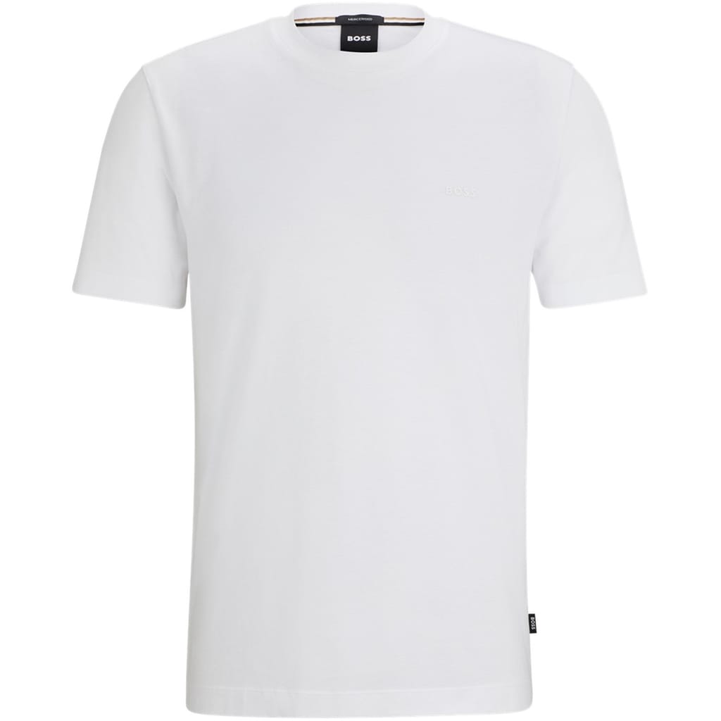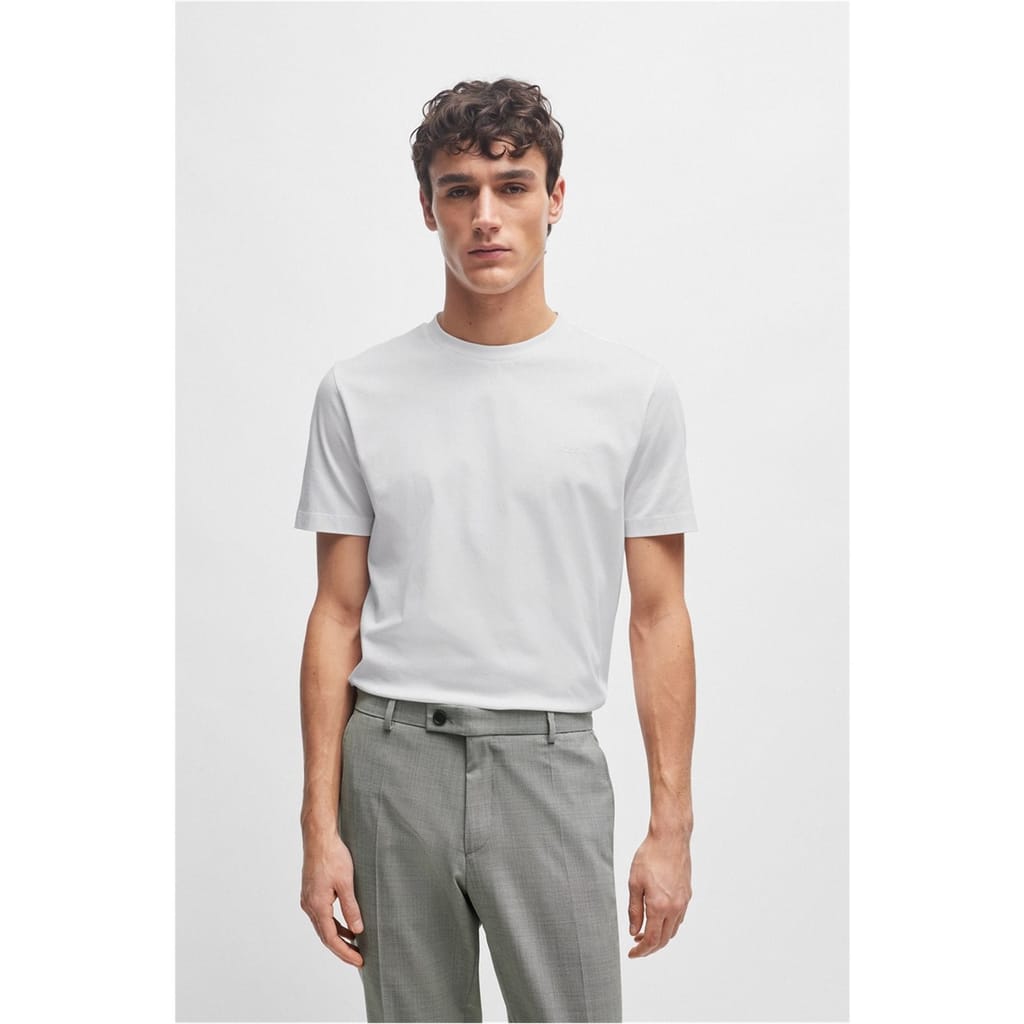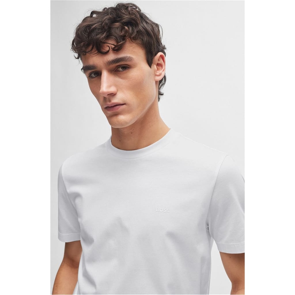 BOSS' Thompson Logo T-Shirt is the perfect addition to your off-duty basics. Expertly crafted in premium cotton jersey, this regular-fit silhouette features a classic rib-knit crew neck, short sleeves, tone-on-tone stitching, and a straight hem. Solid block colouring provides excellent flexibility when styling this top with any ensemble, and the tonal BOSS logo proudly displayed on the chest adds a sleek finish that provides instant brand appreciation. Material Composition: Primary fabric: 100% cotton. Collar: 97% cotton, 3% elastane. Machine wash at 30 degrees.