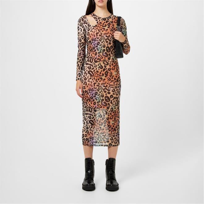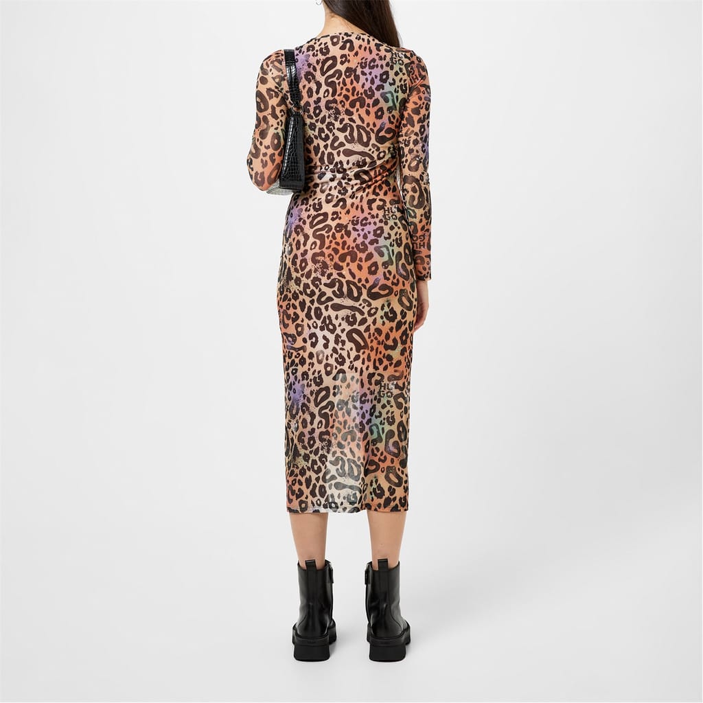 Elevate your wardrobe with this striking midi dress from Hugo. Featuring a bold leopard pattern, this bodycon dress offers a crew neckline and a straight hem for a sleek silhouette. Designed with long sleeves and a slim fit, it provides a stylish yet comfortable wear. -