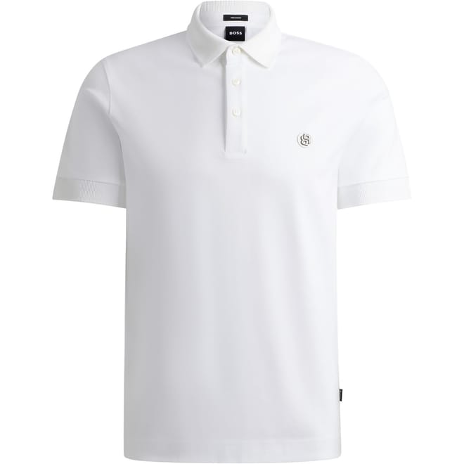 Timeless design meets modern simplicity in this BOSS polo shirt. Featuring clean lines and a classic silhouette, the signature monogram detail adds a subtle touch of luxury to this wardrobe essential. The ribbed cuffs provide a precise fit, while the premium cotton construction ensures lasting comfort throughout the day. A three-button placket and traditional collar maintain the polo's authentic appeal, making it a versatile choice for various occasions.