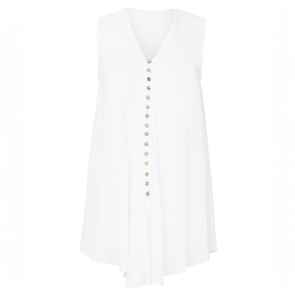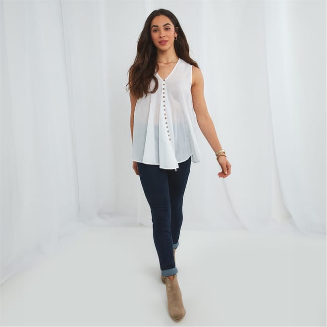A perfect piece for summer, this blouse proves there’s beauty in simplicity. Teaming a stylish V neck and floaty shape, it’s flattering for any figure - and because it’s sleeveless, you’ll always get the sun on your shoulders on those gorgeous summer days. Finished with cute button detailing, this blouse adds a touch of class to any jean-shirt combo.