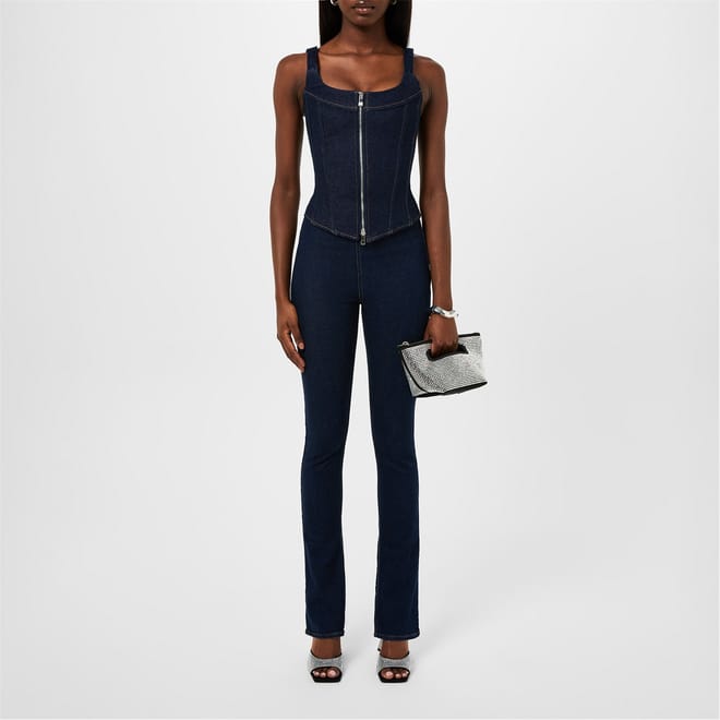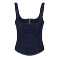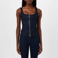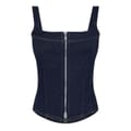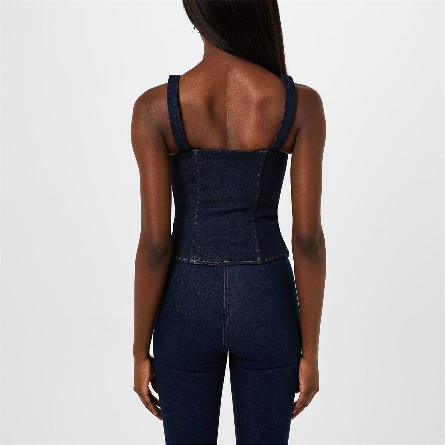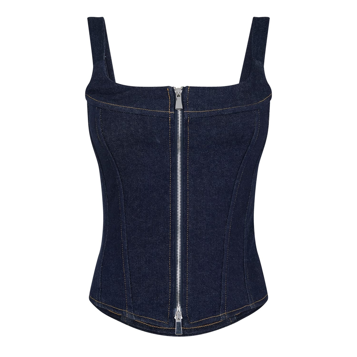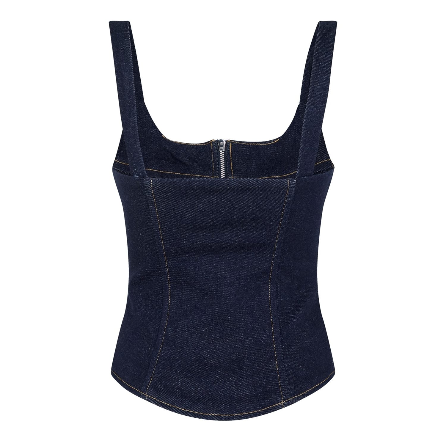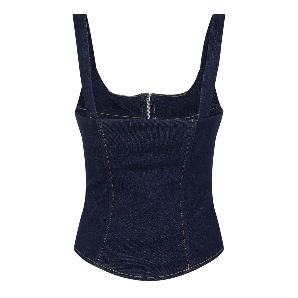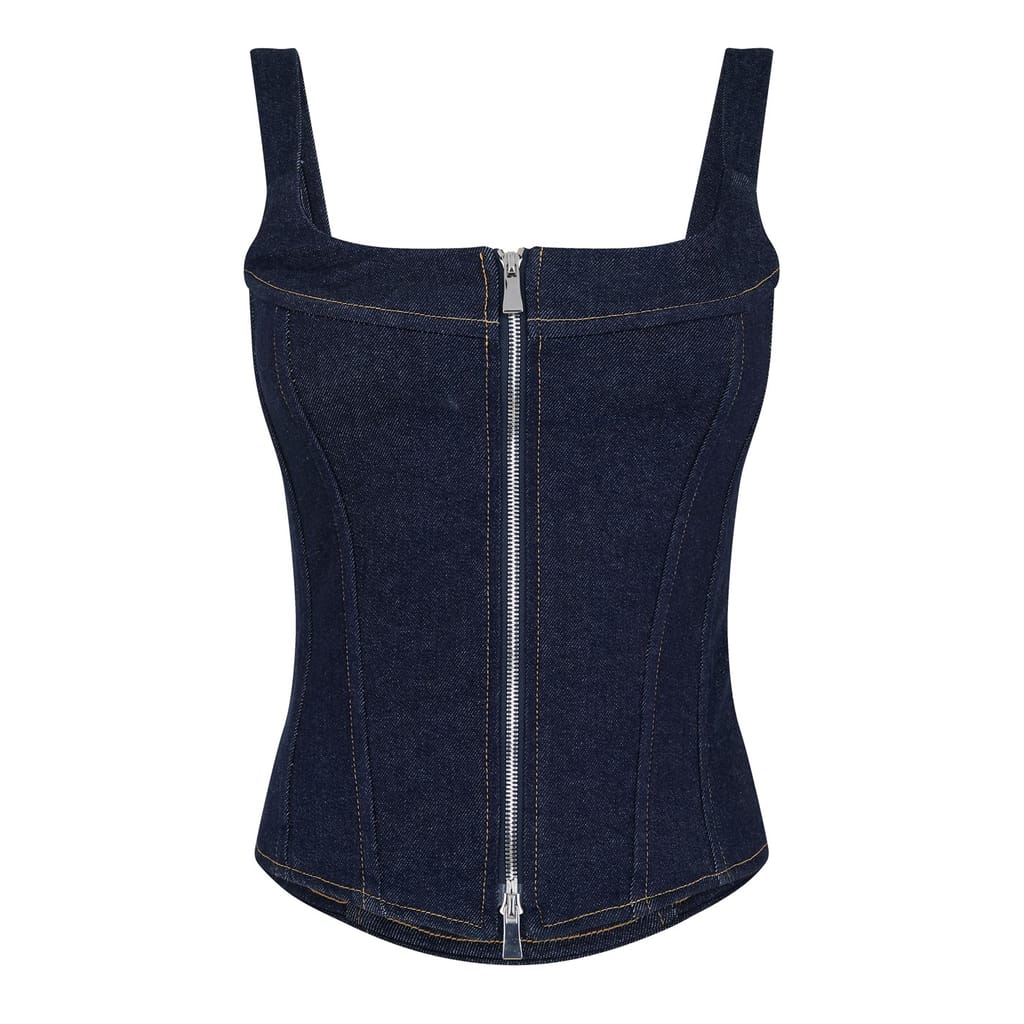 This EB Denim bustier top features a distinctive square neck and a sleeveless design, offering a sleek and modern aesthetic. Designed in a slim fit, it ensures a flattering silhouette. The top incorporates a convenient zipper for closure, combining style with practicality. Perfect for those who appreciate a blend of fashion and function. -