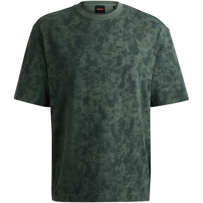 This Boss top features an oversize fit and a crew neck, offering a relaxed and comfortable style. The marble pattern adds a unique touch, while the logo embellishment provides a subtle brand statement. Ideal for those seeking a blend of casual elegance and distinctive design. -