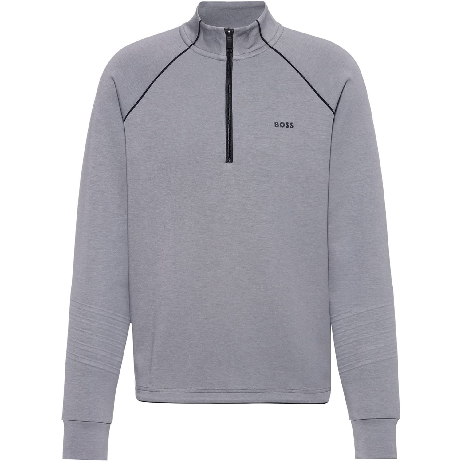 Elevate your casual wardrobe with this Boss sweatshirt. Featuring a zip neck and a quarter zipper closure, this top is both stylish and functional. The long raglan sleeves with ribbed cuffs ensure a comfortable fit, while the solid pattern and logo embellishment add a touch of sophistication. Crafted with a regular fit, this sweatshirt is perfect for effortless everyday wear. -