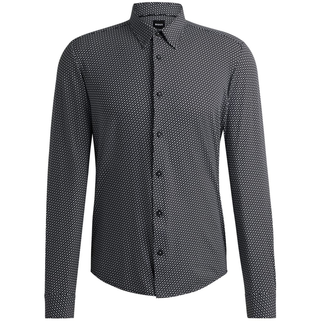 Elevate your wardrobe with this Boss dress shirt. Featuring a classic shirt collar and button closure, this long sleeve shirt offers a sophisticated look. The geometric all-over print adds a modern twist to a slim fit design, making it a versatile addition to your collection. -