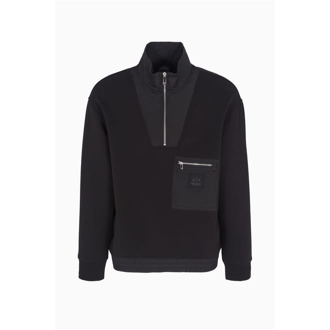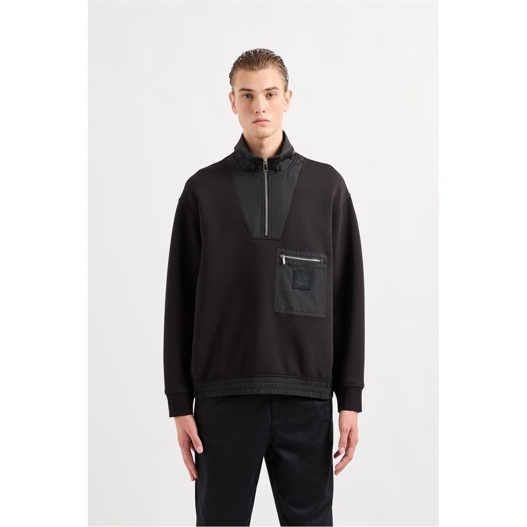 Armani Exchange sweatshirt features a zip neck and a high collar, ideal for a sleek look. The regular fit and long sleeves provide comfort, while the ribbed cuffs offer a snug finish. Embellished with a logo and chest pocket, it combines style with practicality. The design is completed with a zipper closure for ease and convenience. -