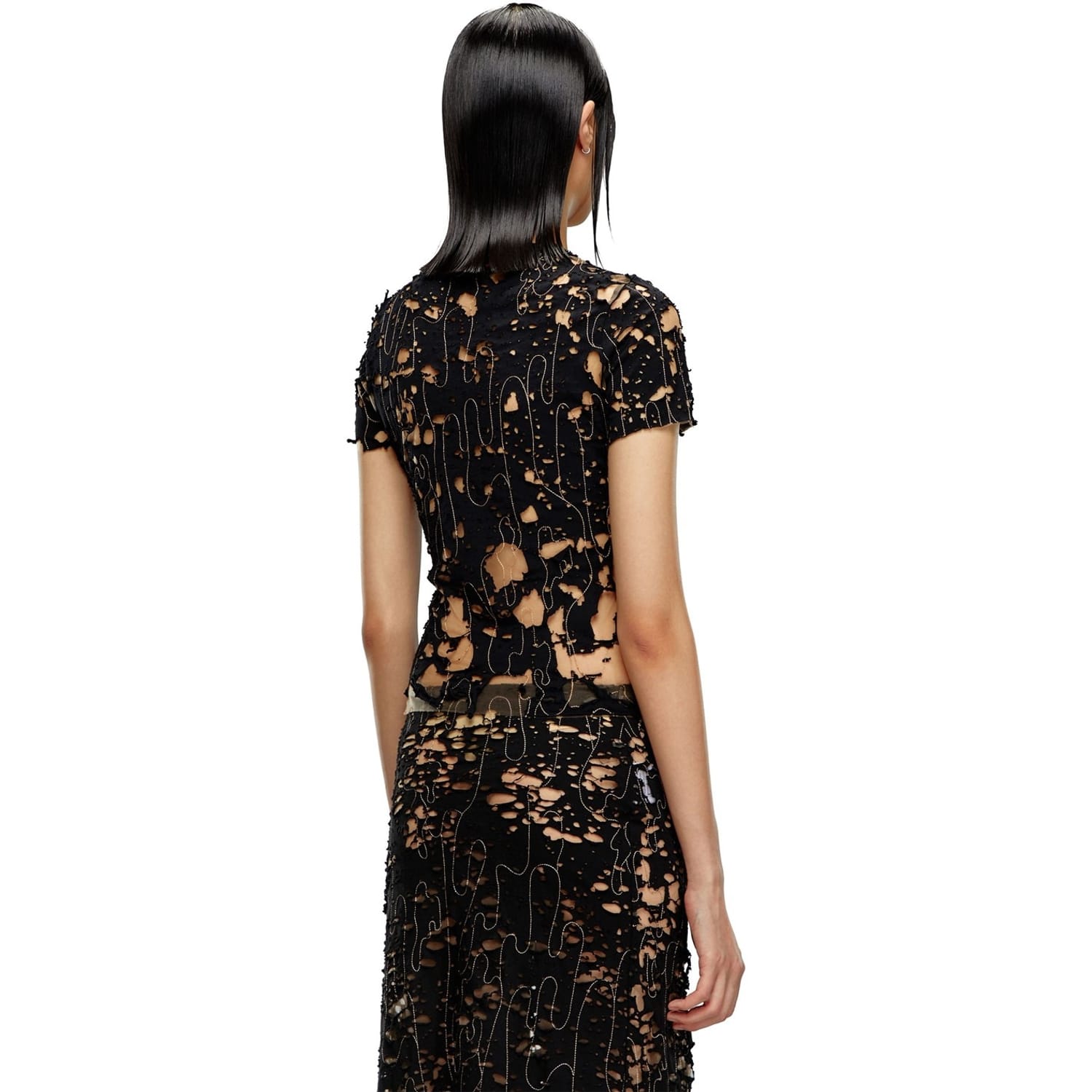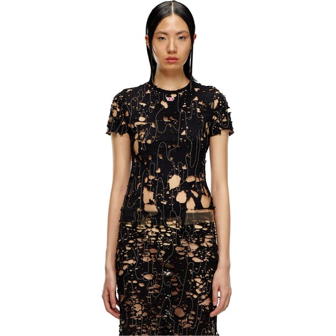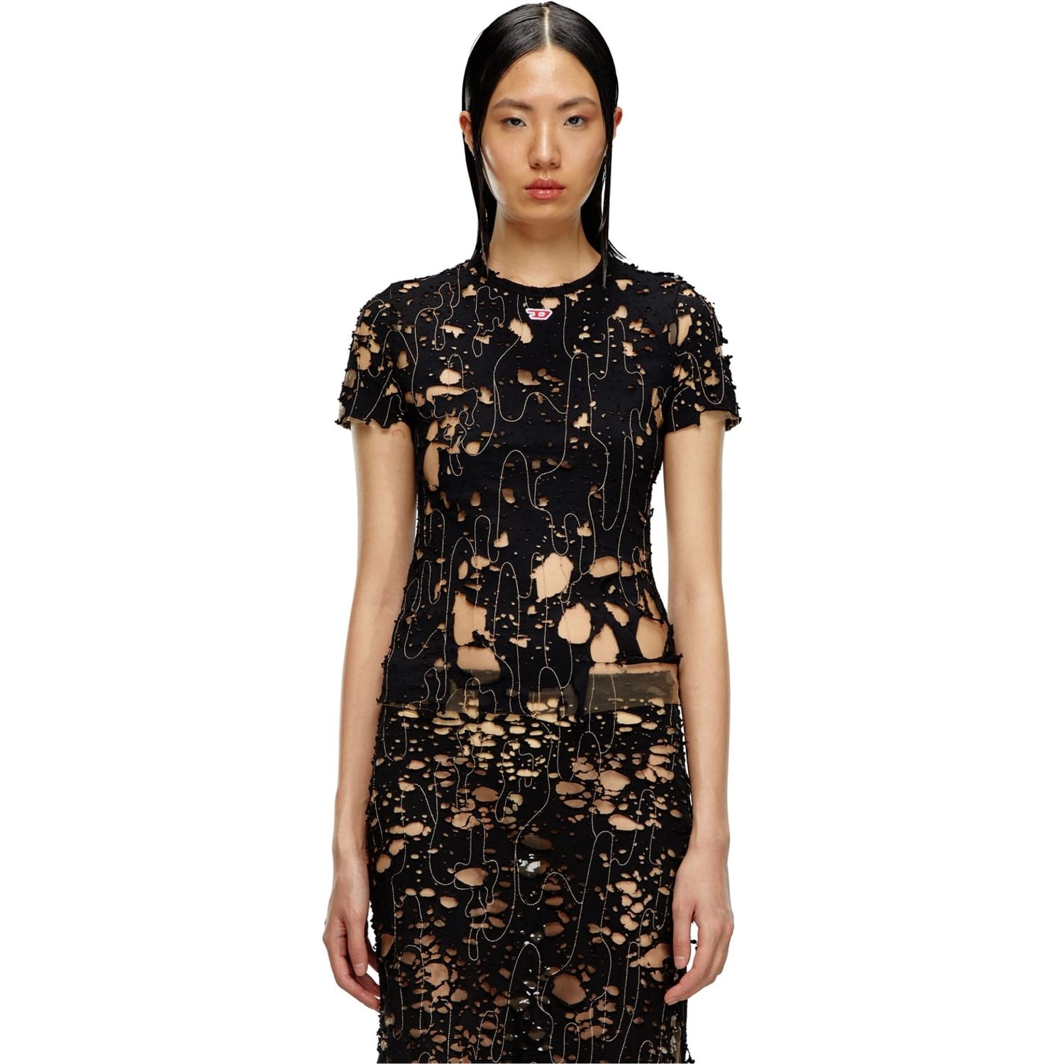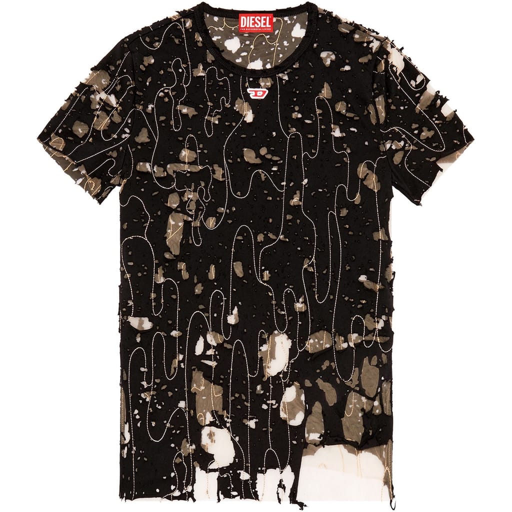 Elevate your wardrobe with this Diesel slim fit t-shirt. Featuring a crew neck and short sleeves, this top showcases a striking abstract graphic print. The Diesel logo embellishment adds a touch of brand recognition, making it a stylish choice for any casual occasion. -