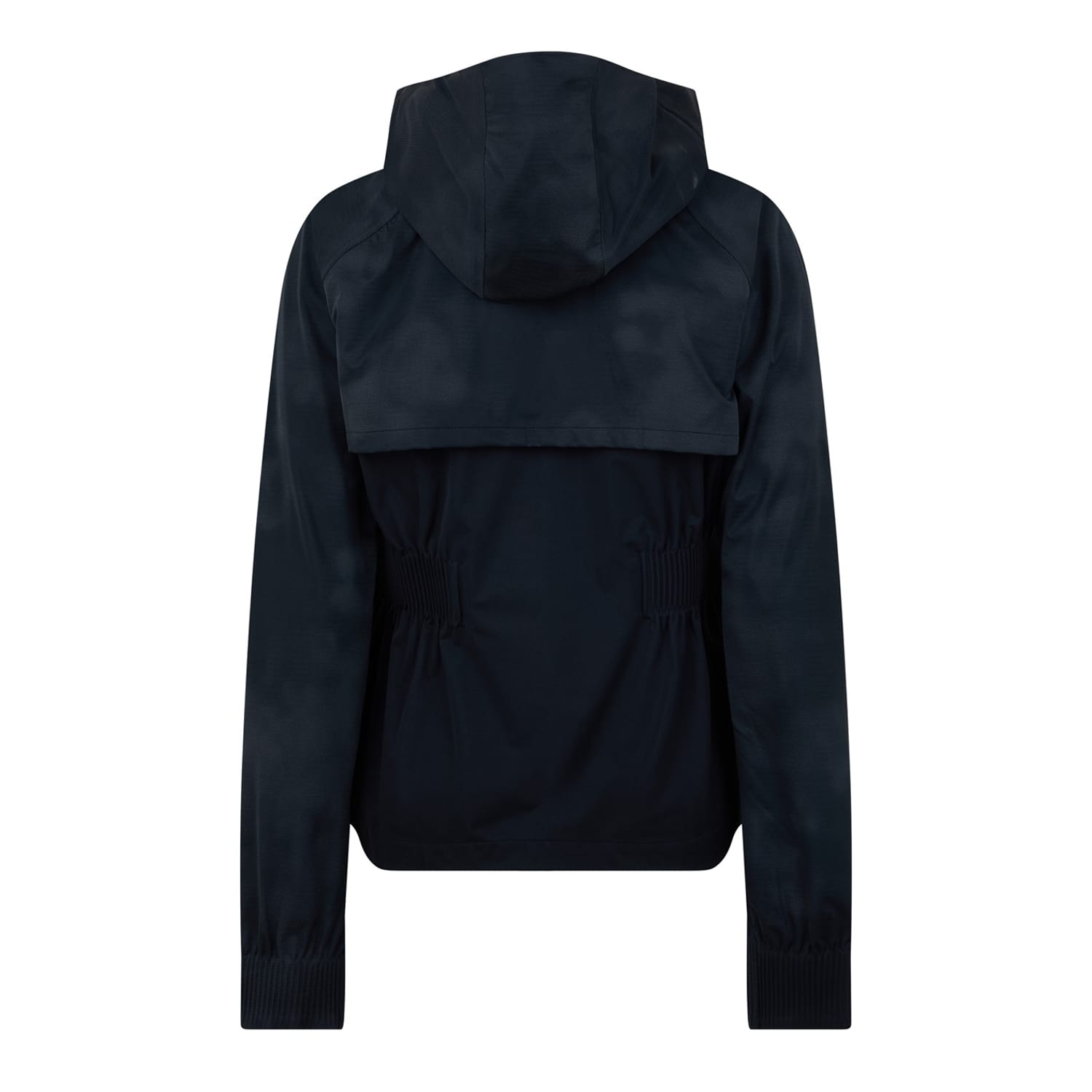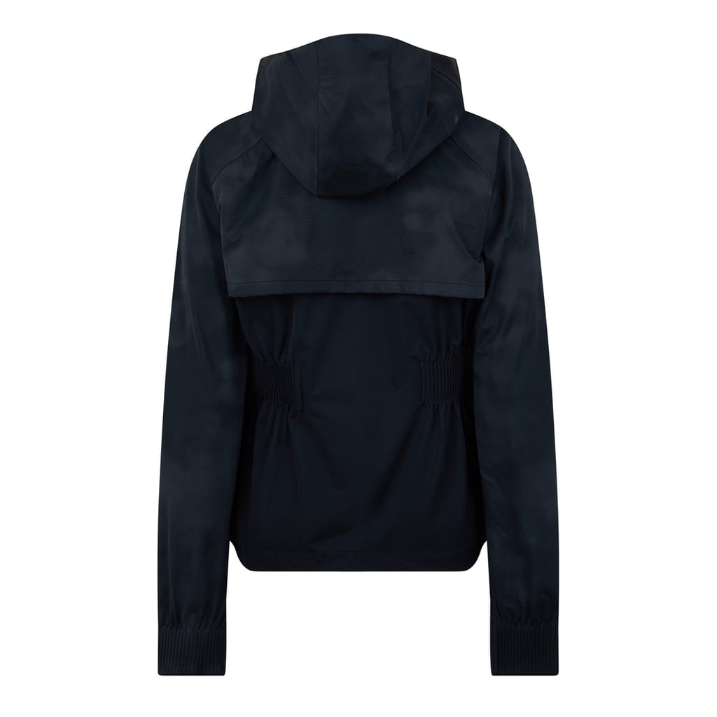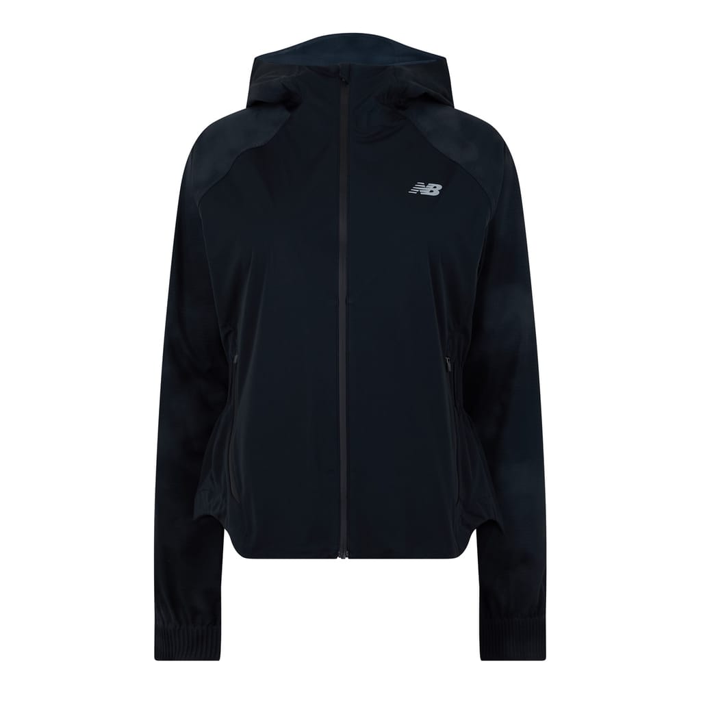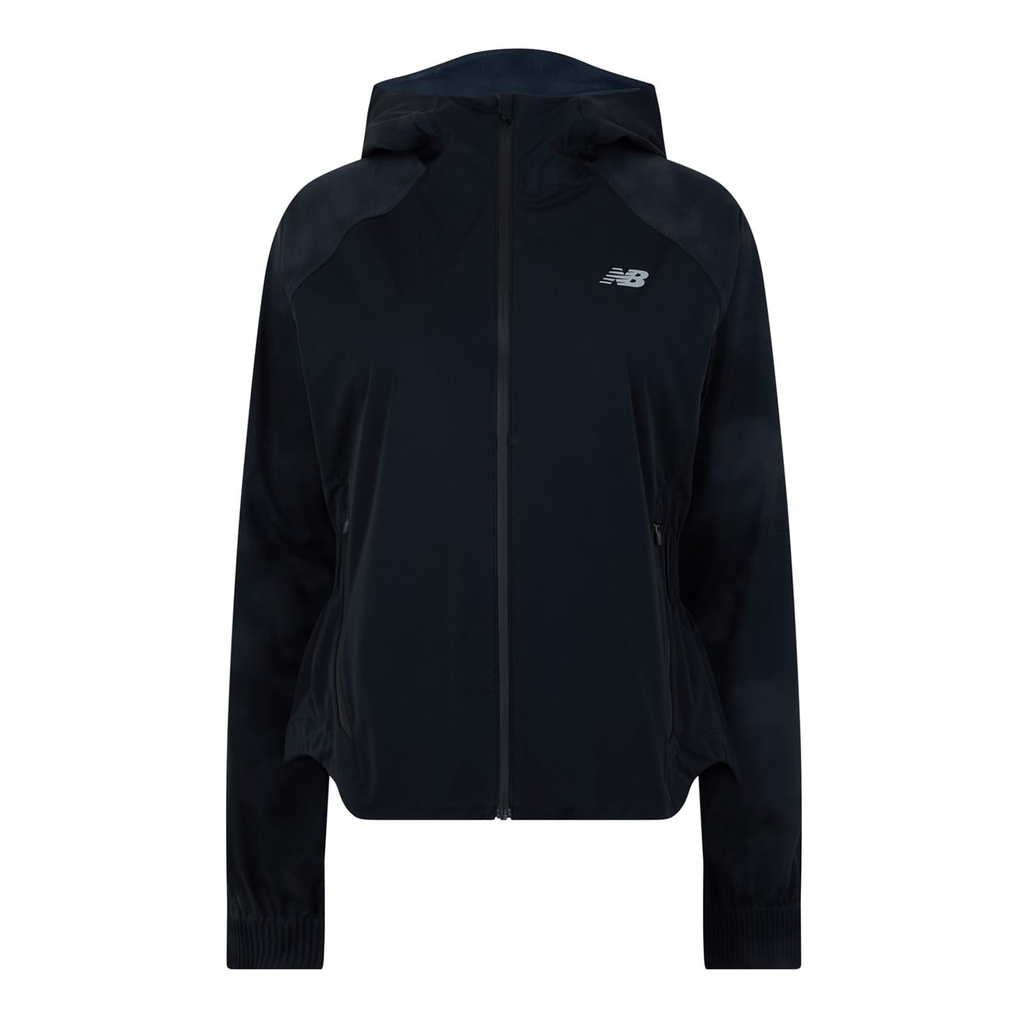 The New Balance performance jacket from the activewear collection features a hooded design and a relaxed fit. It includes a zipper closure and ribbed cuffs for added comfort. The solid pattern is complemented by a logo embellishment, making it a practical choice for those seeking functionality and style. -