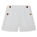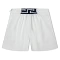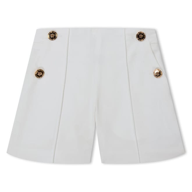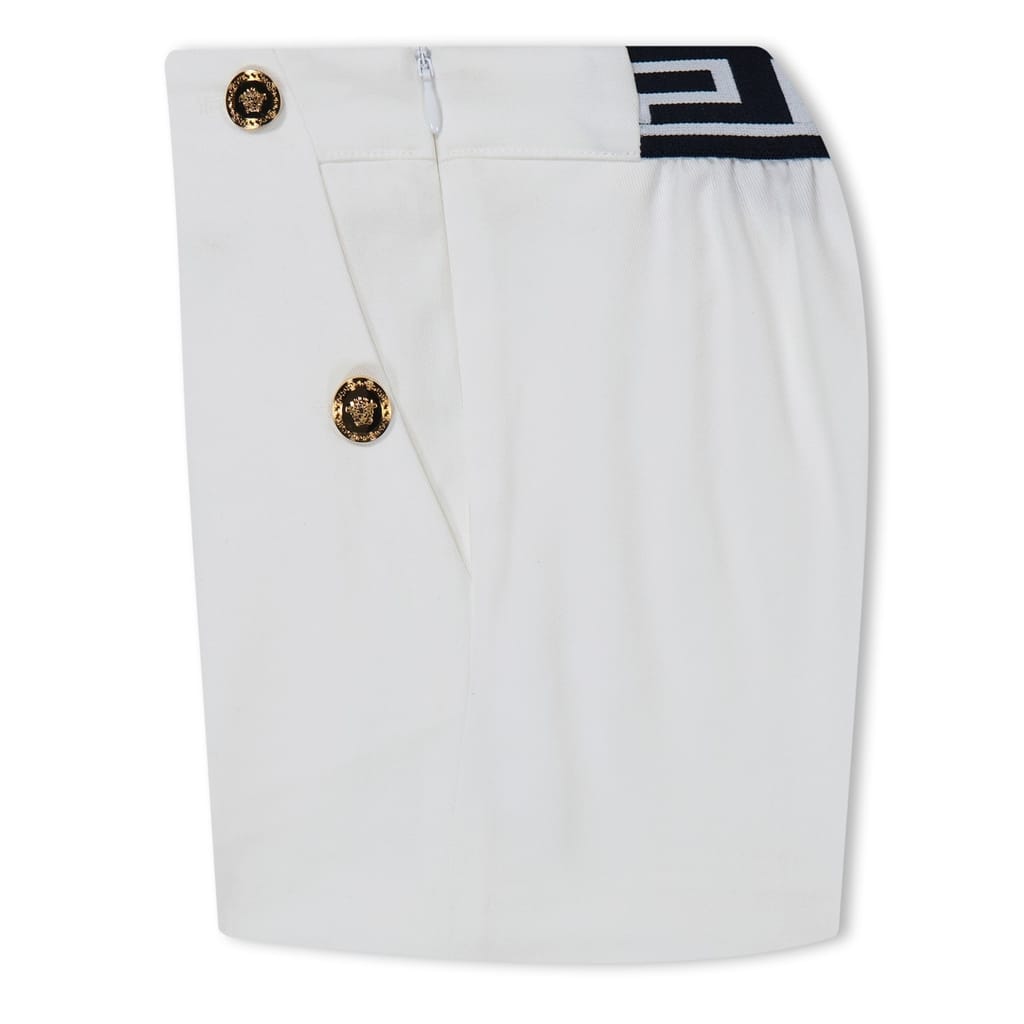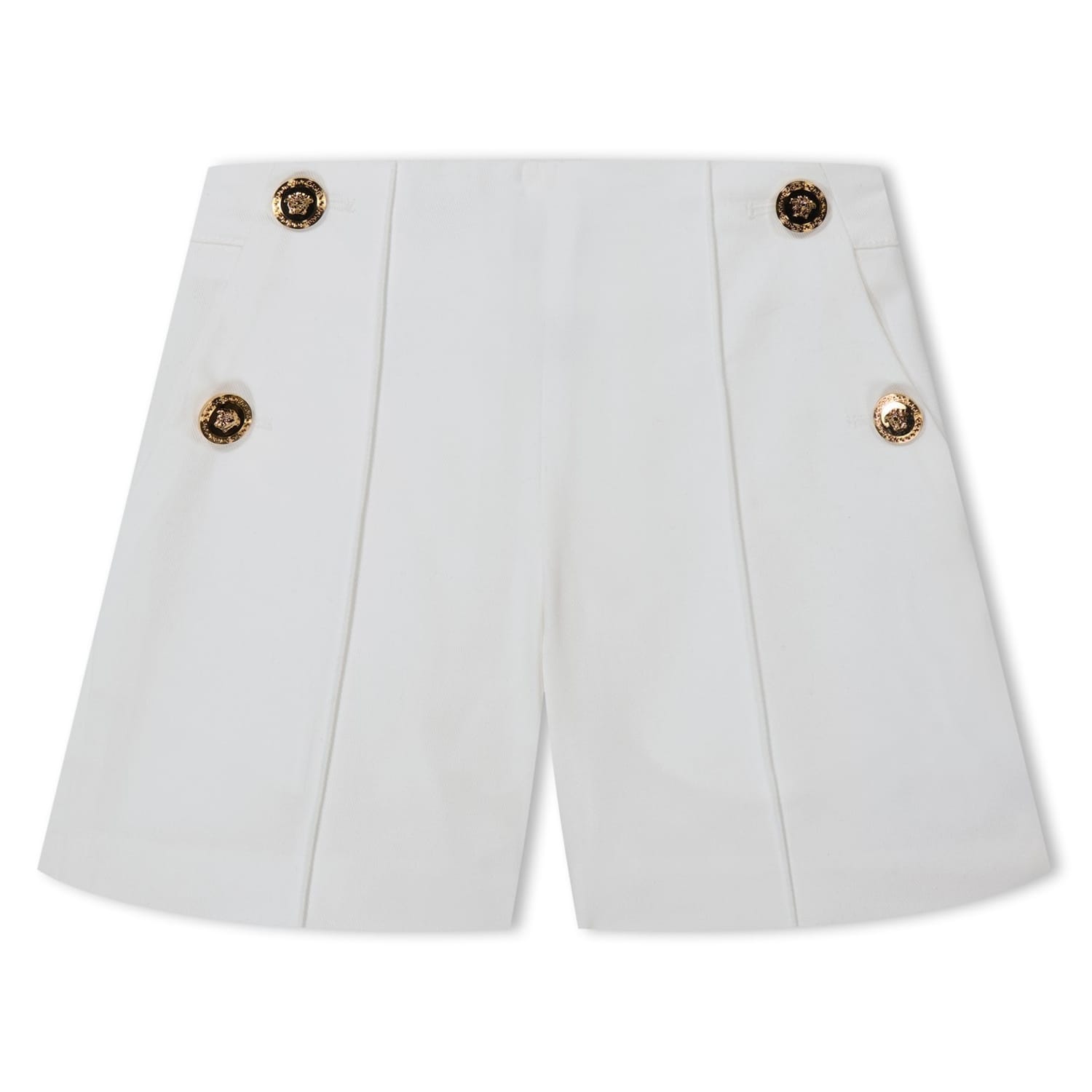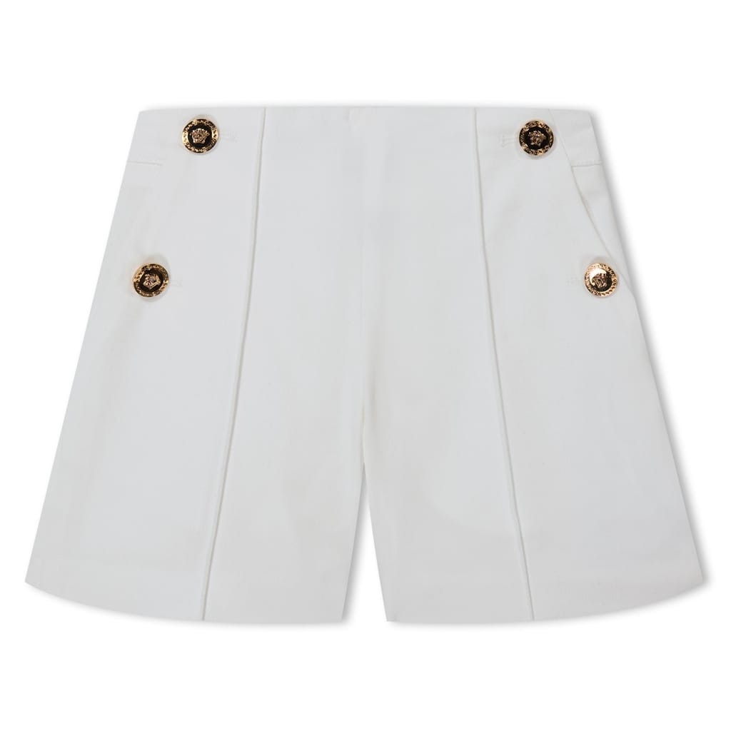 These Versace shorts feature a solid pattern and are adorned with a distinctive logo embellishment. Designed with a button and zipper closure, they offer a sleek and stylish look. Perfect for those who appreciate luxury and attention to detail. -