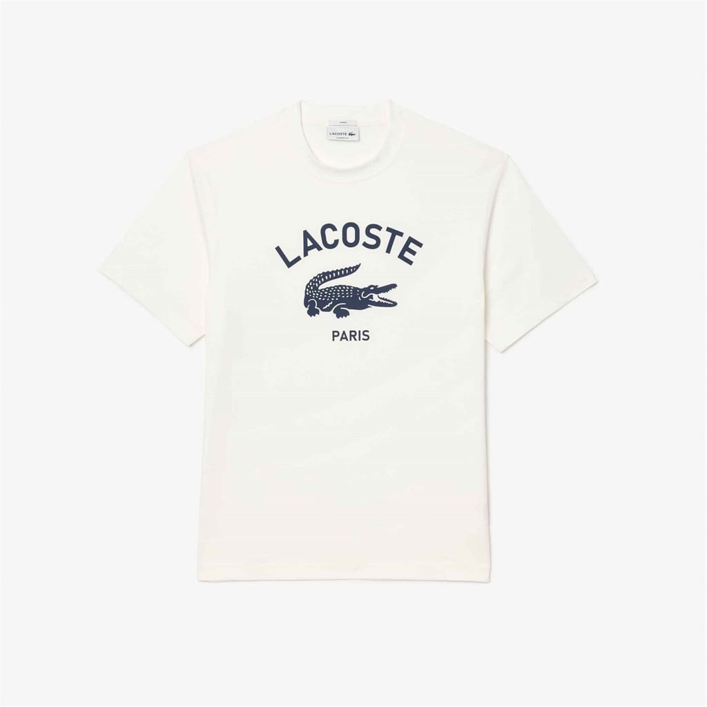 Discover the Lacoste Paris T-Shirt from the casual collection. This regular fit top features a classic crew neck and short sleeves. It showcases a distinctive graphic print with the iconic crocodile embroidered logo, adding a touch of unique style. Ideal for elevating everyday looks while maintaining comfort and effortless flair. -