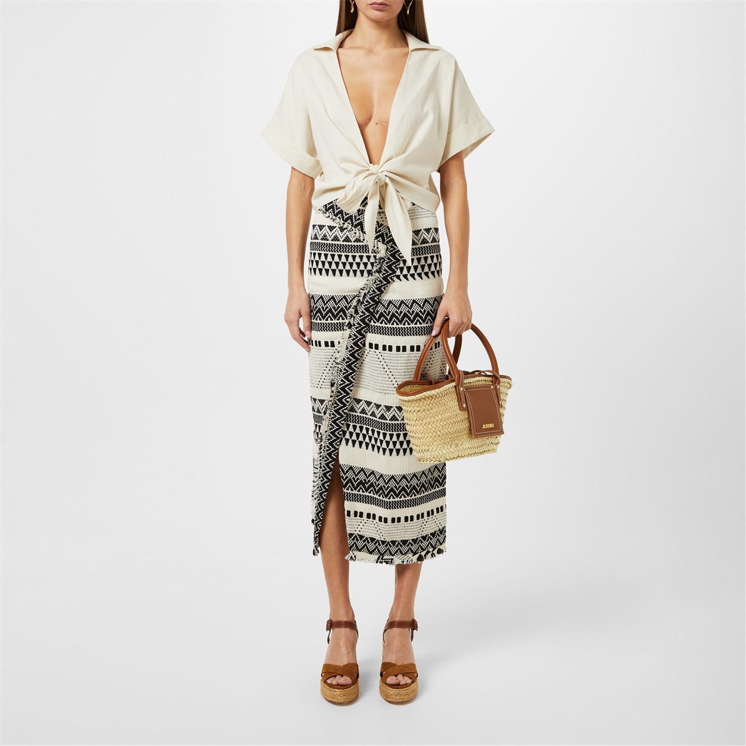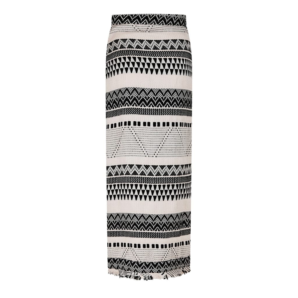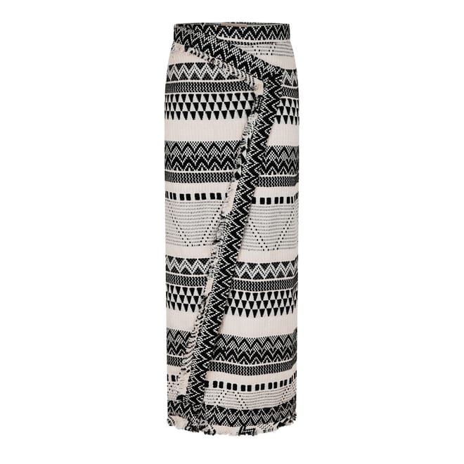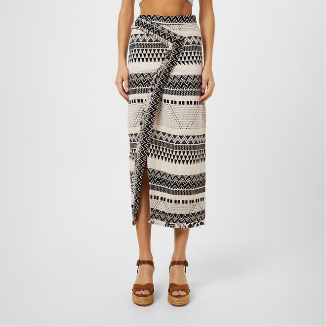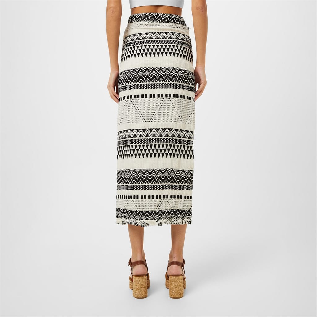 Discover the JBQ midi wrap skirt, a perfect addition to your casual collection. This relaxed fit skirt features a striking geometric pattern and is adorned with fringe embellishments, offering a unique and stylish look. Ideal for those seeking a blend of comfort and contemporary design. -