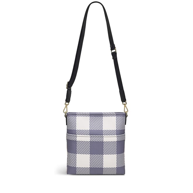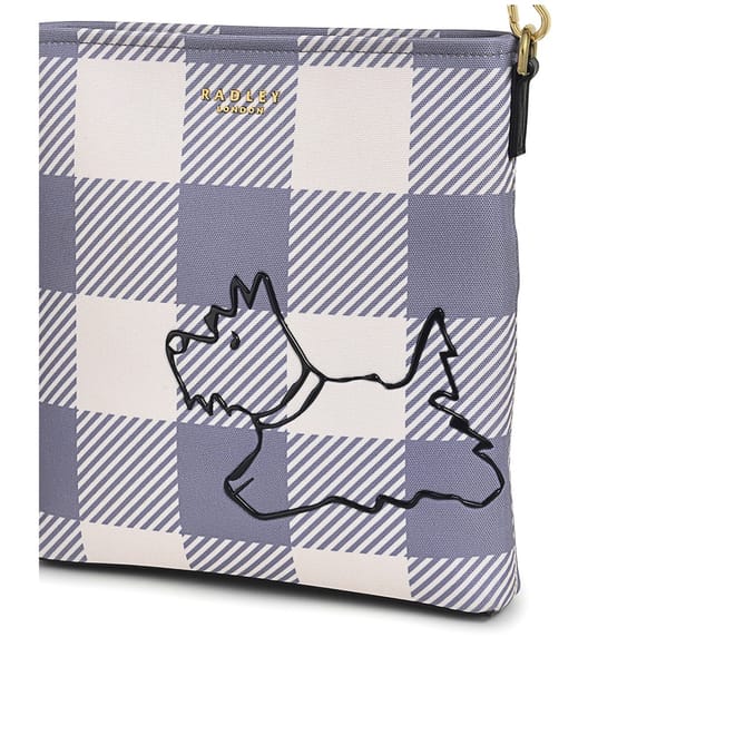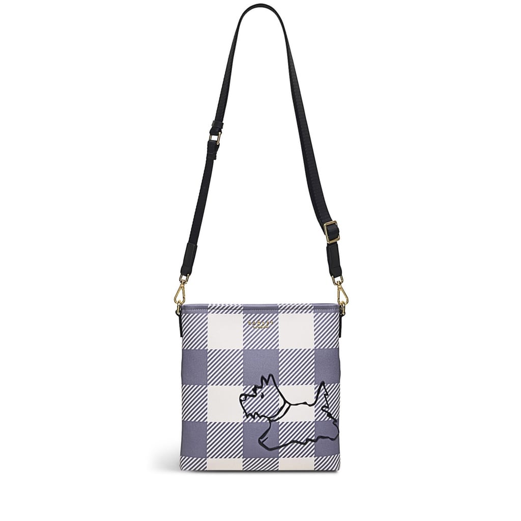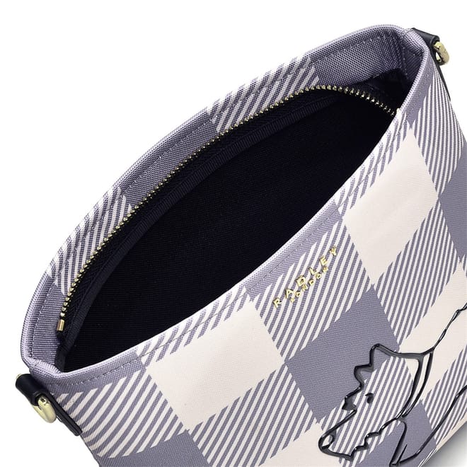 Ready for walkies. Radley dog is the main character on the Palace Gardens bag, with his cheeky silhouette appearing in a raised, rubberised print. The slim shape is inspired by our signature Pockets cross body but swaps the leather for checked responsible polyester and contrast water-based PU trims.