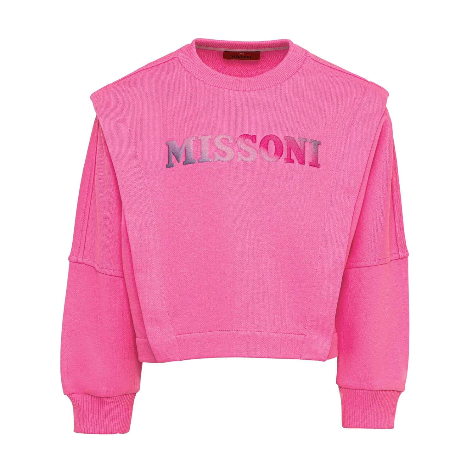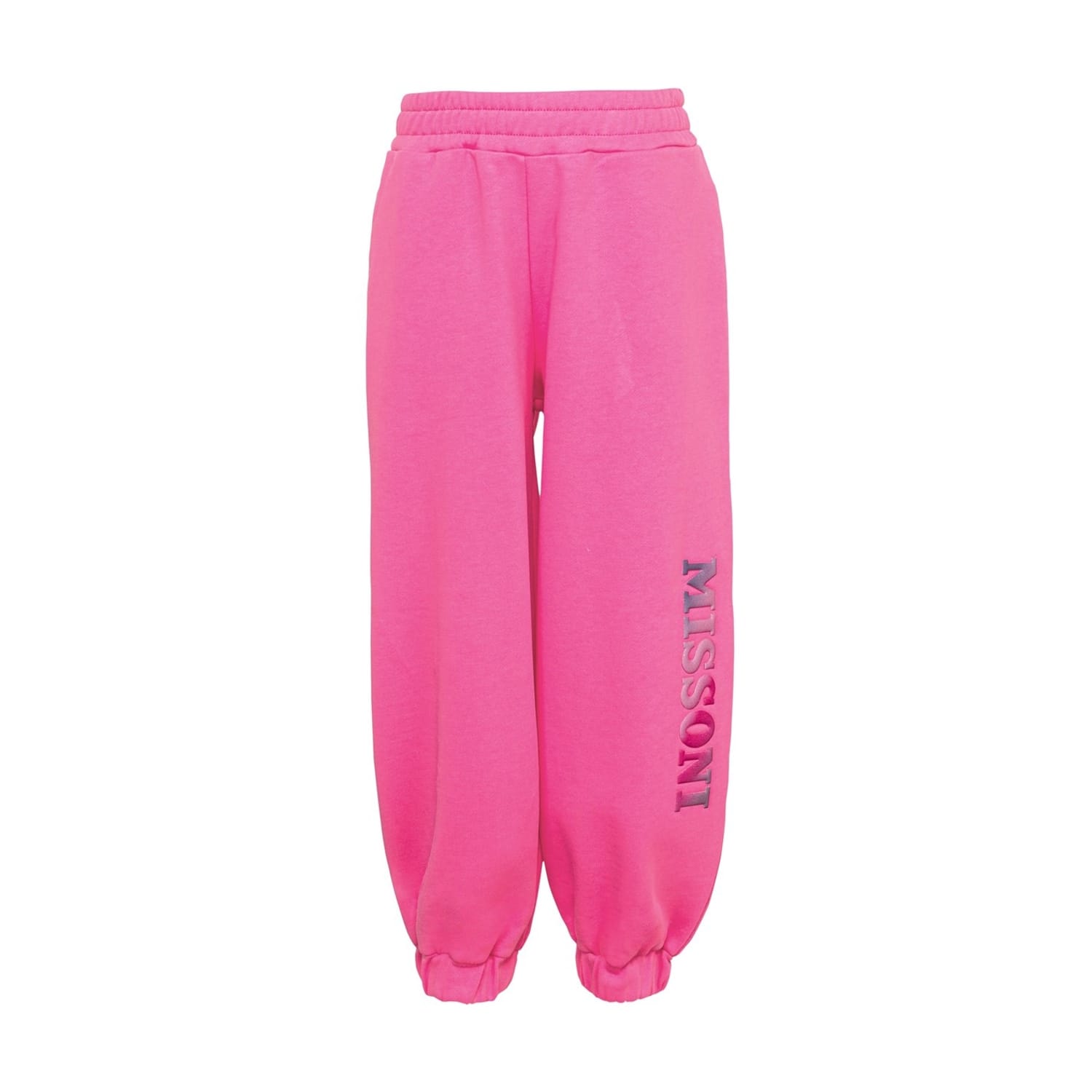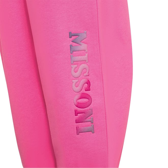 - Complementing this ensemble are the jogging bottoms, adorned with an elasticated waist and cuffs for a secure and comfortable fit. Equipped with side pockets, your child can keep their essentials close to hand no matter where their adventures take them. Highlighting both pieces, the iconic Missoni logo is artfully constructed in glittery shades of purple and pink, a testament to the house's mastery of design. Whether your little one is playing with friends or heading on -