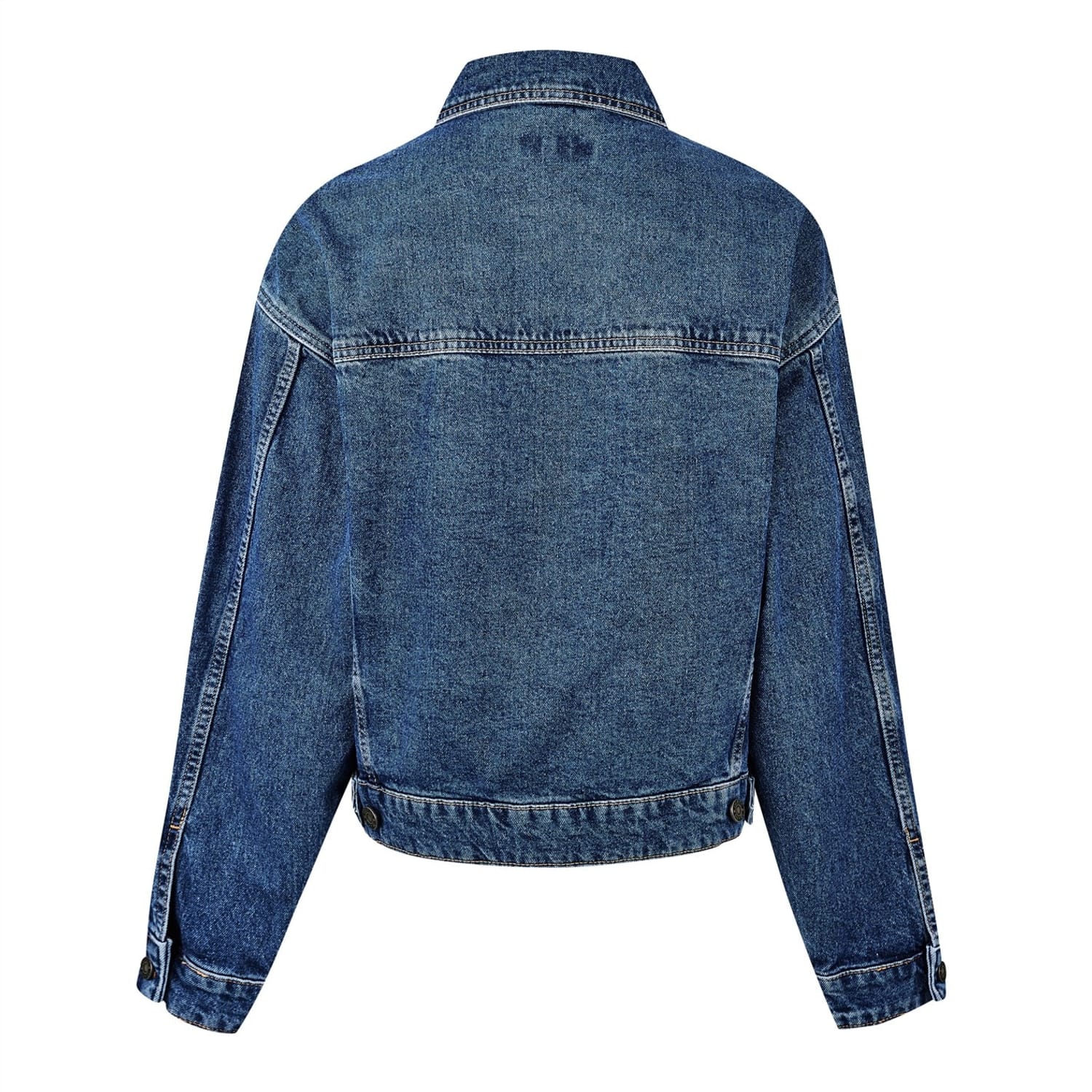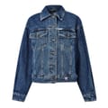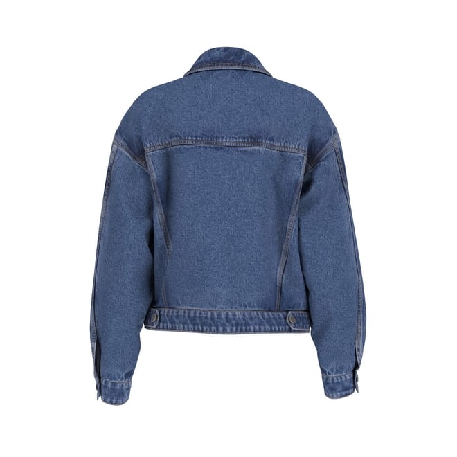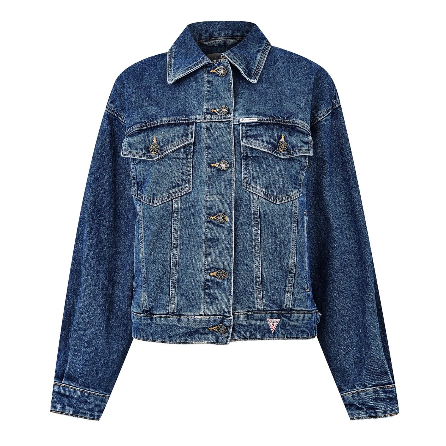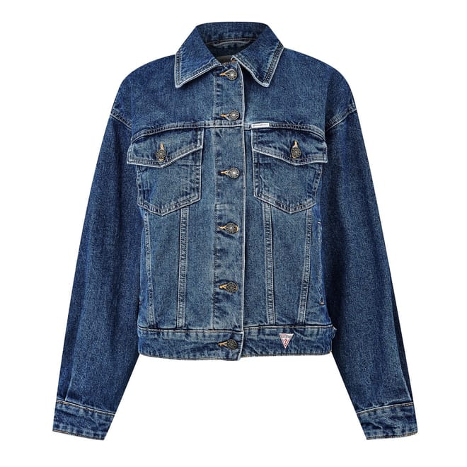 This Guess denim jacket features an oversize fit and a classic shirt collar. It boasts a button closure and a solid pattern, complementing its short length. The jacket is adorned with a logo and includes practical front pockets, adding both style and functionality. A timeless piece for any wardrobe. -