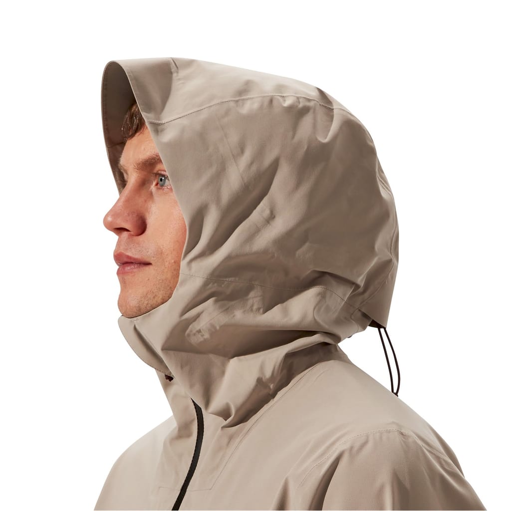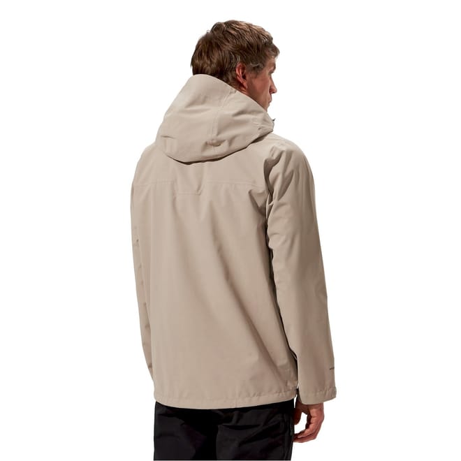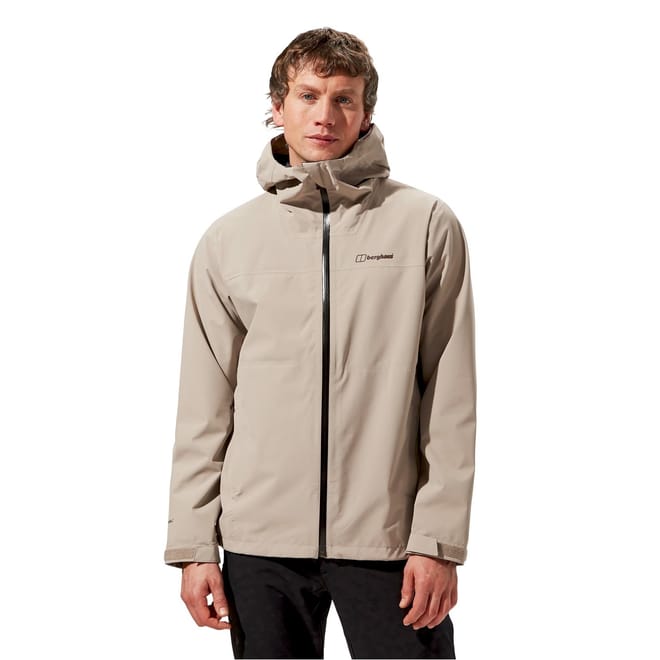 The Berghaus rain jacket is designed for practicality and style. Featuring a hood and high collar, it offers protection against the elements. The water-repellent fabric ensures you stay dry, while the elasticated cuffs and straight hem provide a comfortable fit. The jacket includes a zipper closure and a subtle logo embellishment, all in a solid pattern for a sleek look. -