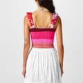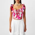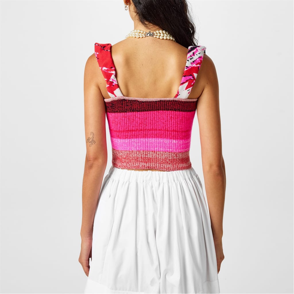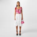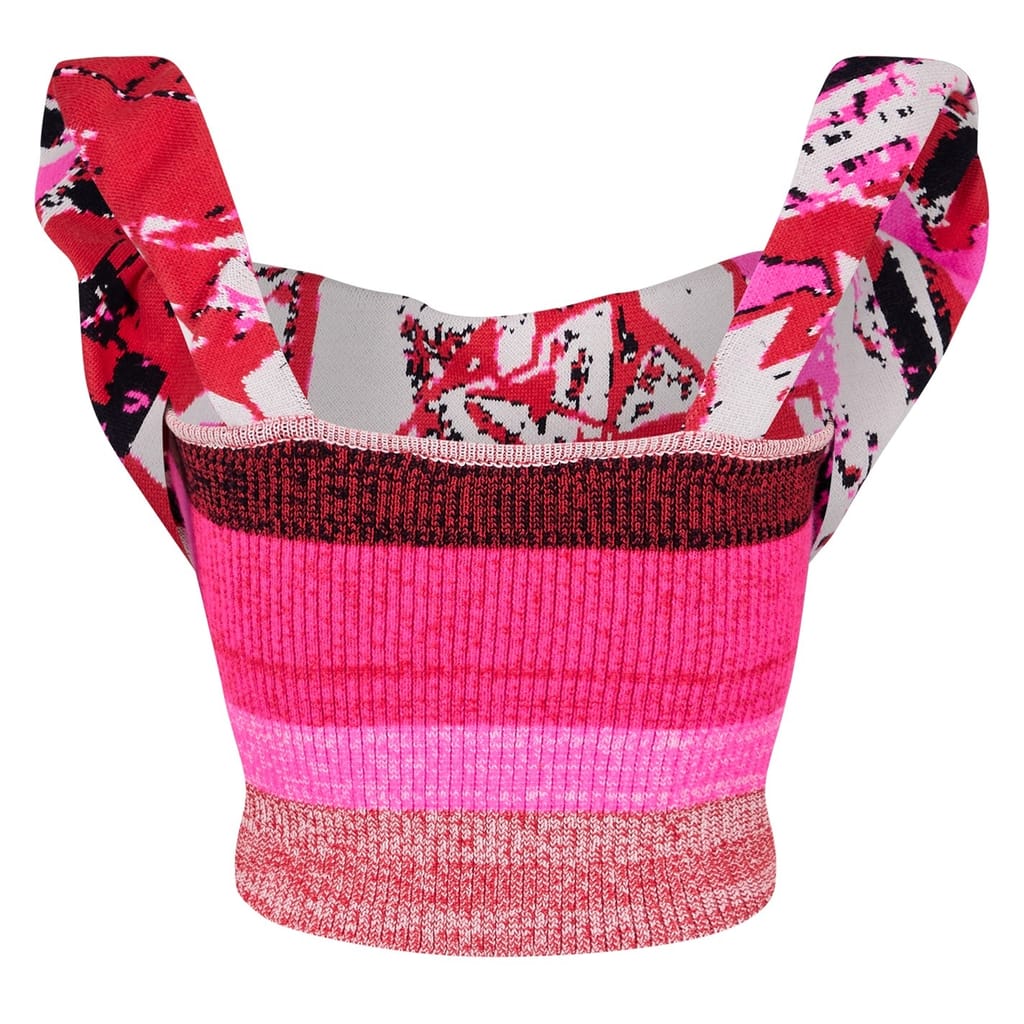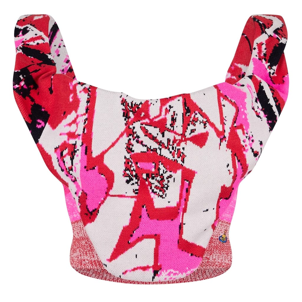 This Vivienne Westwood top features a striking graffiti pattern, offering a unique style statement. The cropped design and square neck add a modern touch, while the slim fit ensures a flattering silhouette. A subtle logo embellishment completes the look, making it a distinctive addition to your wardrobe. -