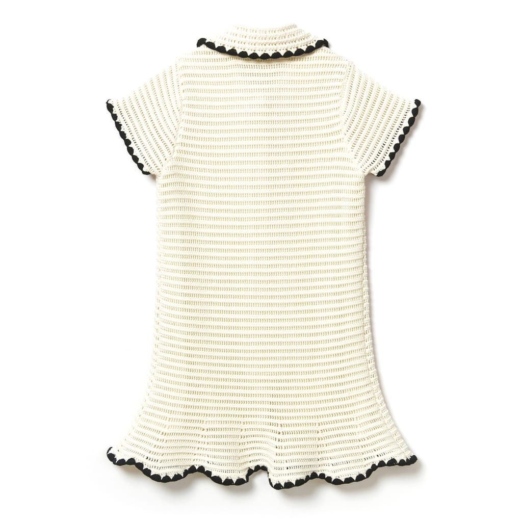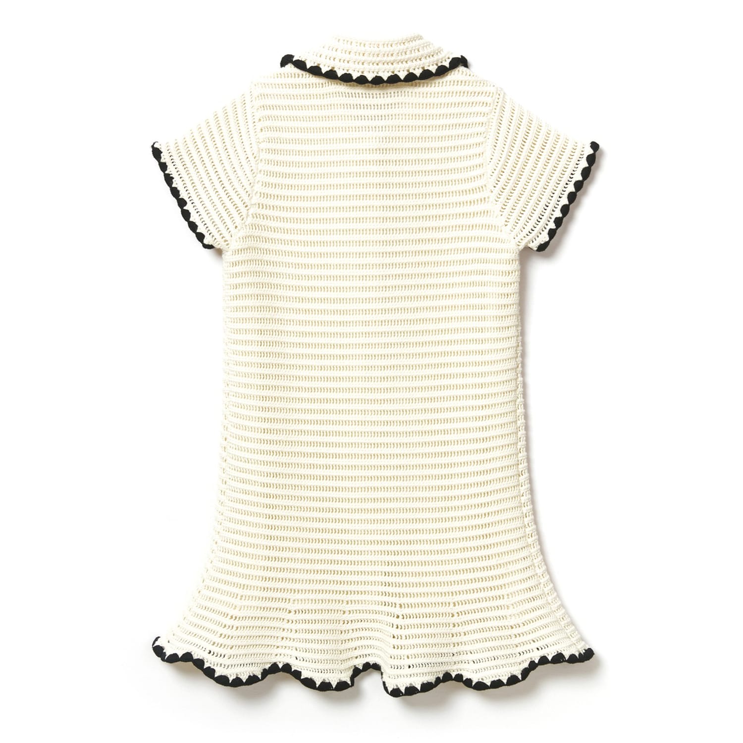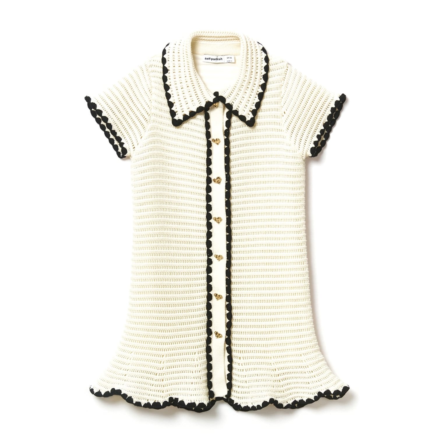 This Self-Portrait mini dress features a collared neck and point collar, offering a sophisticated touch. The A-line style is enhanced by intricate crochet details, creating a unique pattern. A button closure adds practicality, while the curved hem provides a flattering finish. Short sleeves complete the elegant design, making it a standout piece for any occasion. -