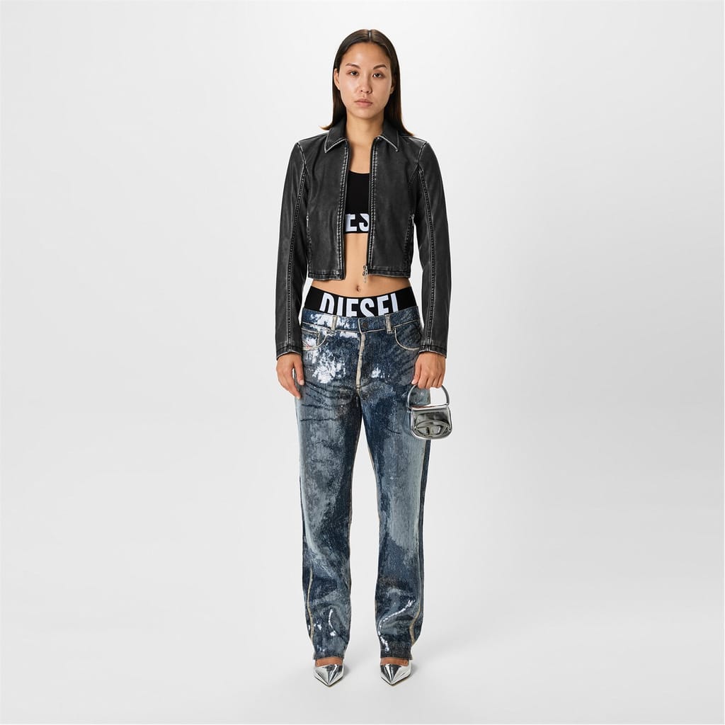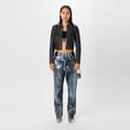 Women's denim five-pocket shorts with a relaxed-leg, knee-length fit.