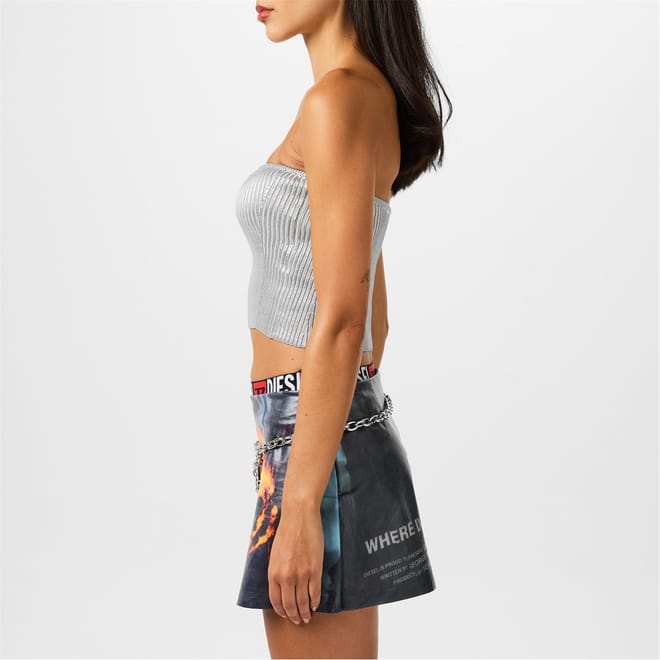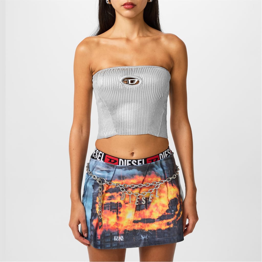 Unleash your inner style with Diesel's De-Slimmy M-Clarksville Bandeau, a brand renowned for its rebellious and unconventional luxury. Embellished with the signature logo plaque cut out at the chest, exuding a bold designer stamp. From cocktail parties to chic soirées, this top boasts luxury and style.