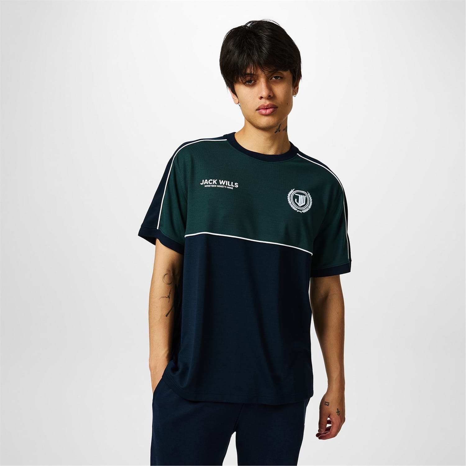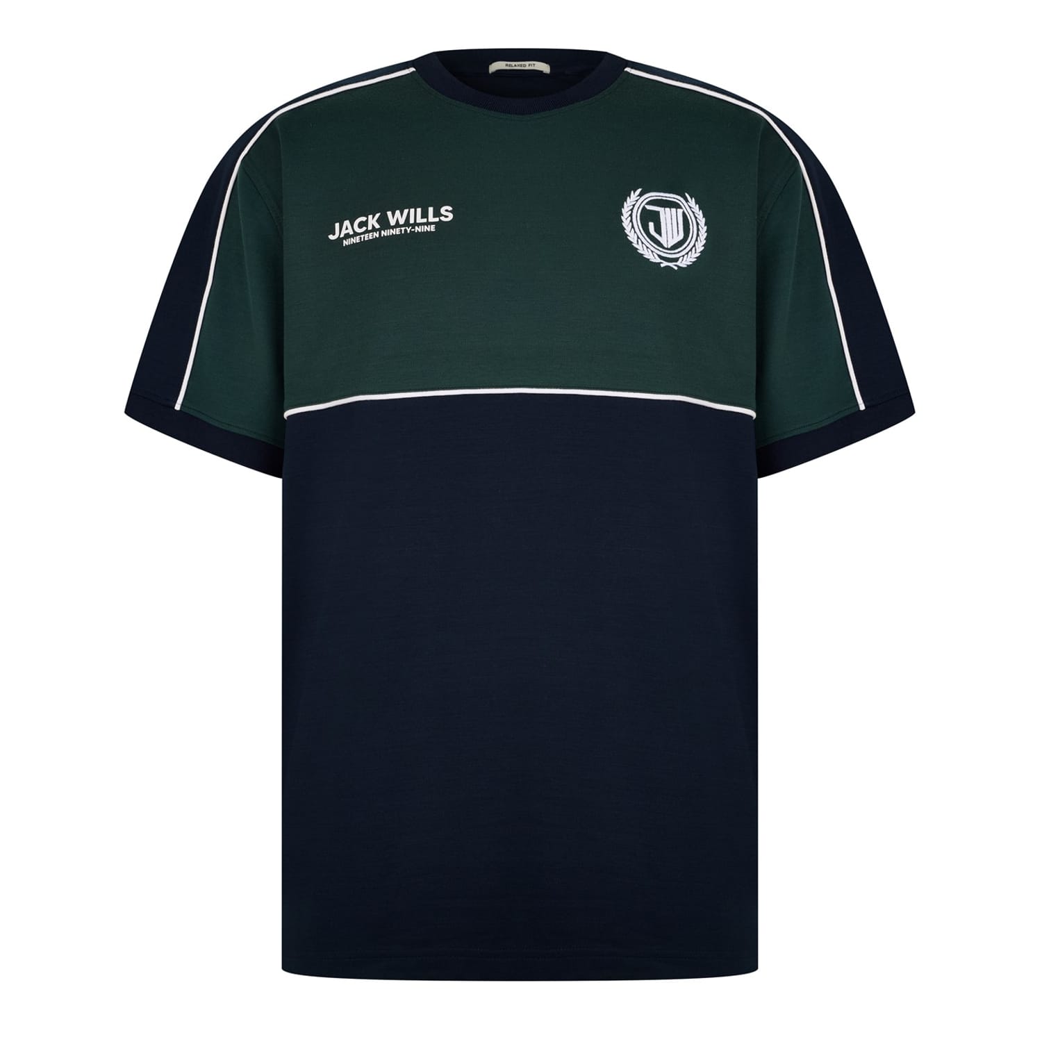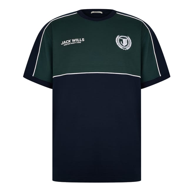 This Jack Wills t-shirt is a staple for casual wardrobes. Designed in a regular fit, it features a crew neck and short sleeves for comfort. The color block pattern is enhanced by piping, contrast stitch, and a subtle logo, adding unique detailing to this top. Perfect for everyday wear, this t-shirt combines style and practicality. -