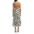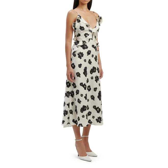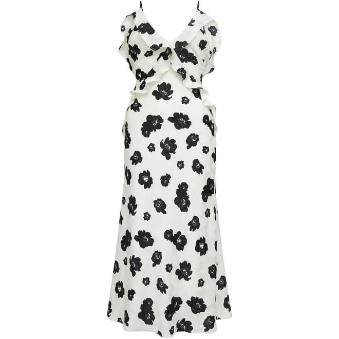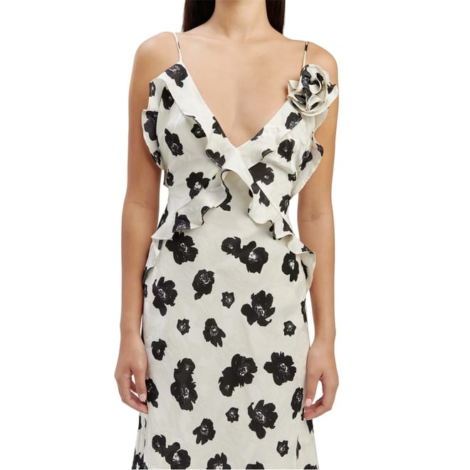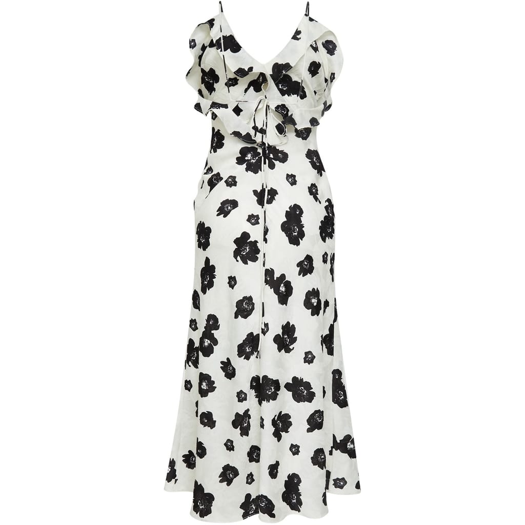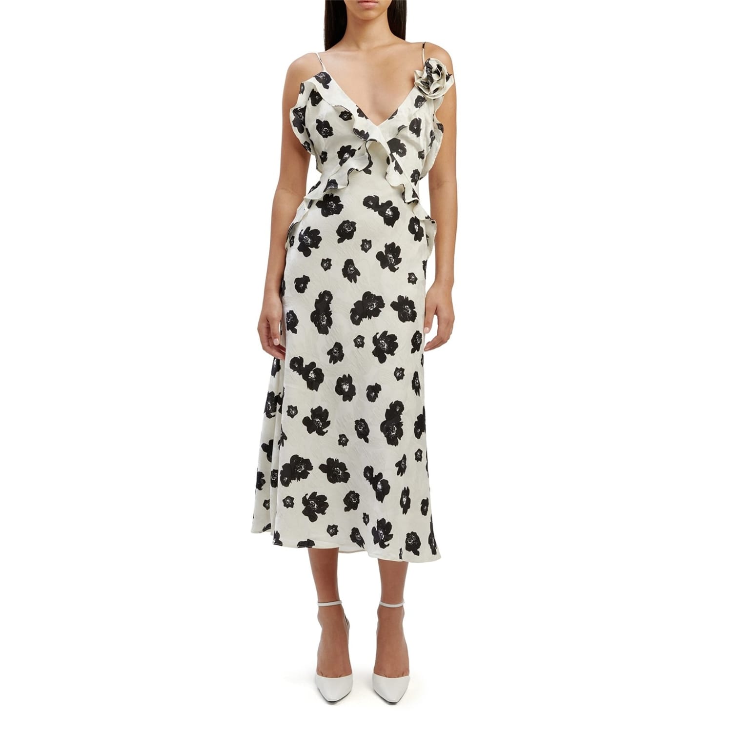 This Bardot midi dress features a v-neckline and spaghetti straps, offering a regular fit. The floral pattern adds a touch of elegance, while ruffle embellishments provide a playful detail. The tie-back closure ensures a secure and comfortable fit. -