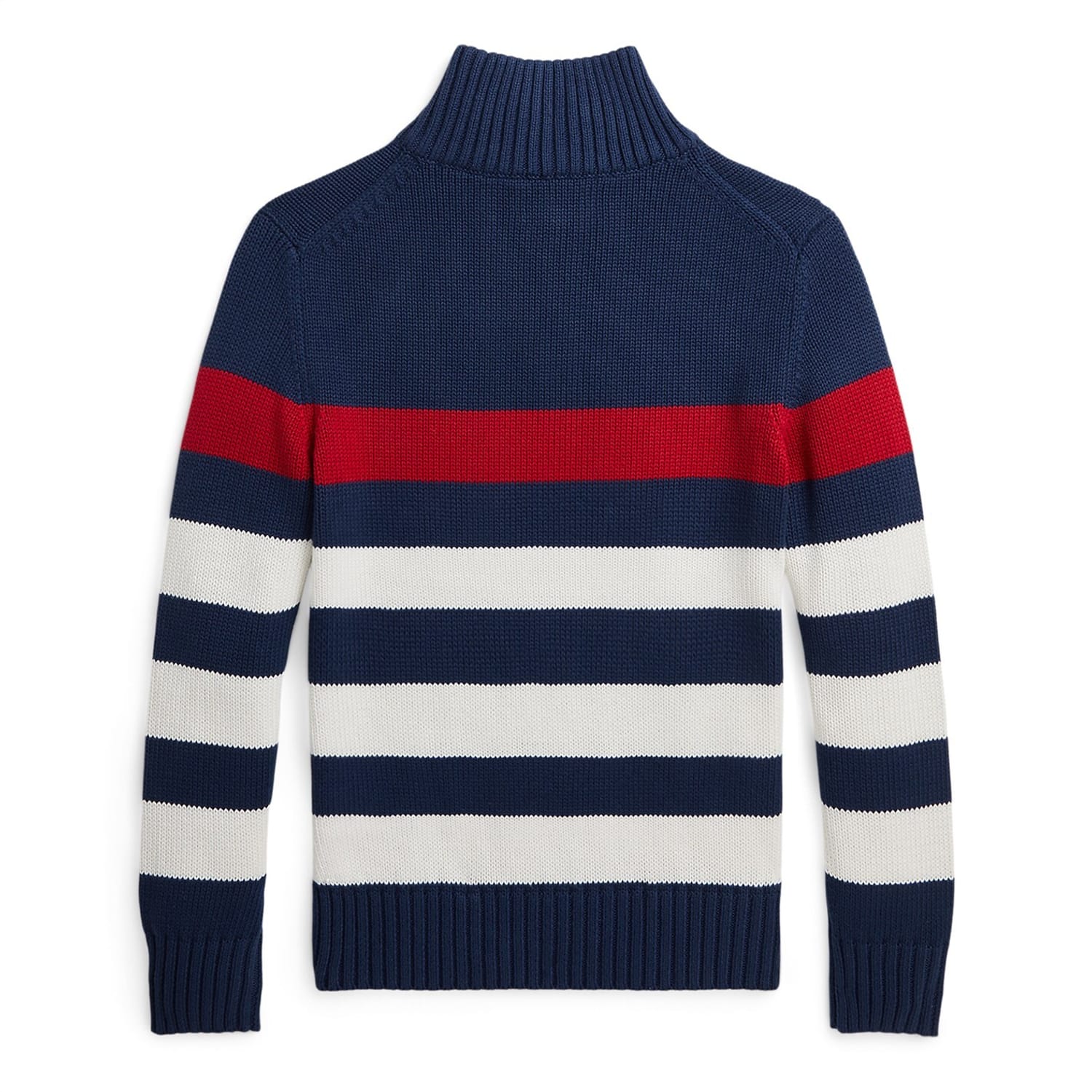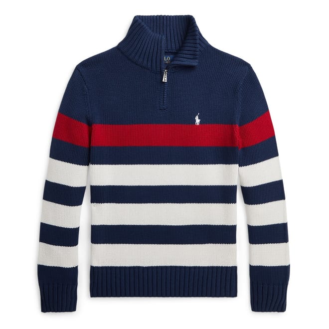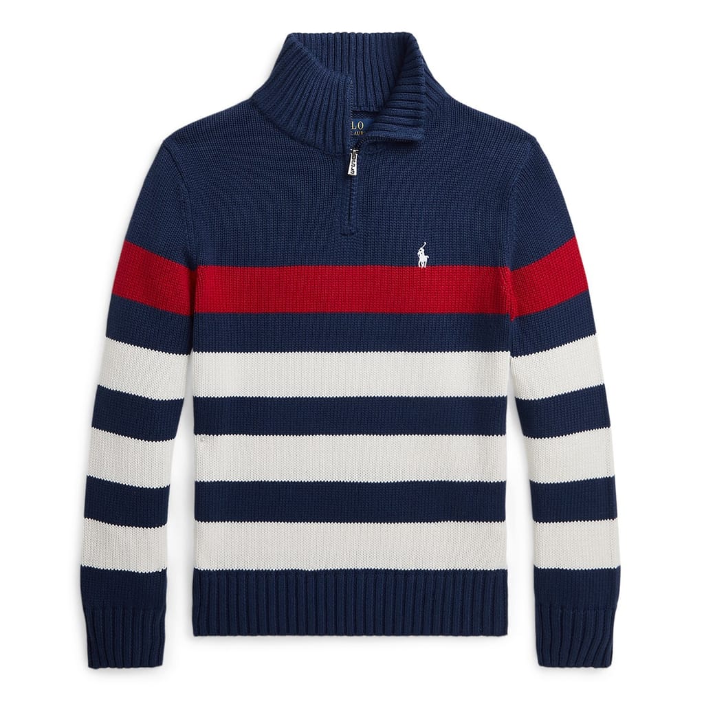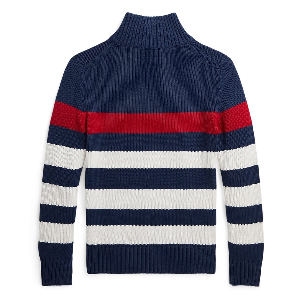 - Designed in navy with striking red and white striped detailing offering a visual appeal, while the signature embroidered Pony at the left chest pays tribute to the brand's heritage. Whether your youngster is attending a family event or having a casual day out, the Polo Ralph Lauren Striped Quarter-Zip Sweater is the perfect piece for any occasion. Pair with tailored trousers or jeans for a complete ensemble.