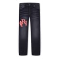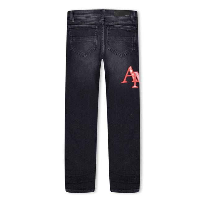 Amiri jeans feature a graphic print and a five-pocket design, offering a stylish straight fit. The jeans are adorned with a logo embellishment, adding a distinctive touch. They come with a zip fly and button closure, ensuring a secure fit. Perfect for those seeking a blend of fashion and functionality. -