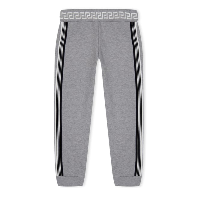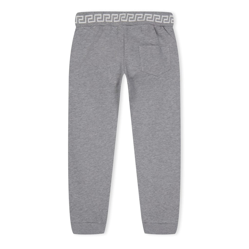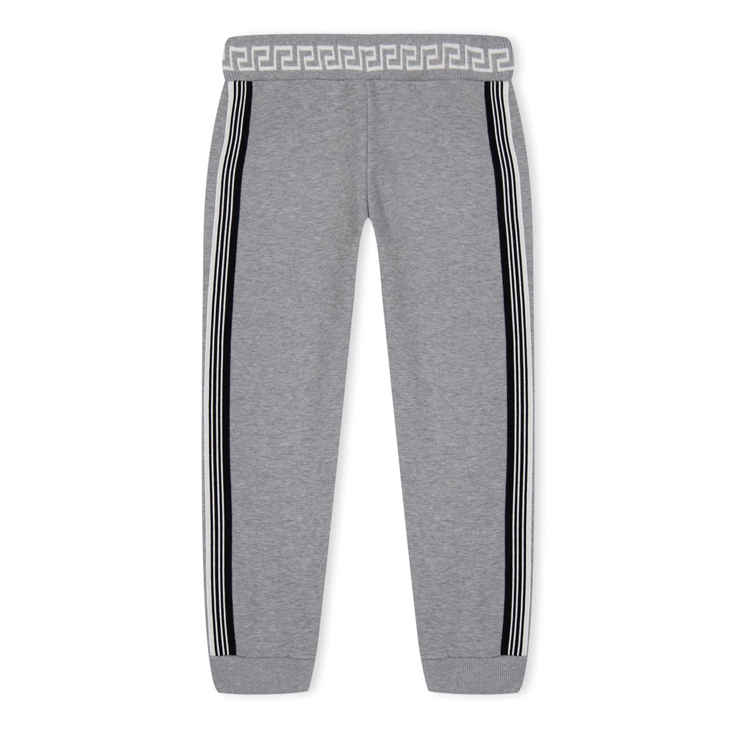Versace joggers feature a striking stripe pattern with side stripes and a logo embellishment. Designed for a regular fit, these joggers offer a stylish and comfortable option for casual wear. -