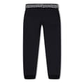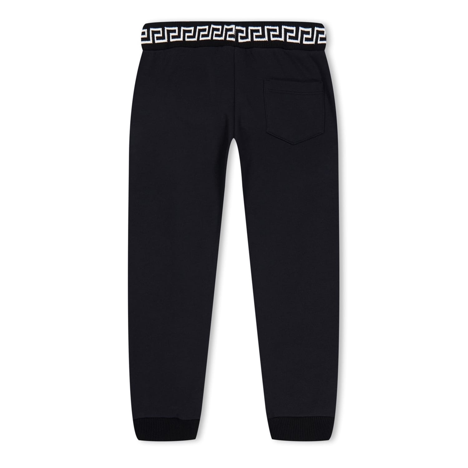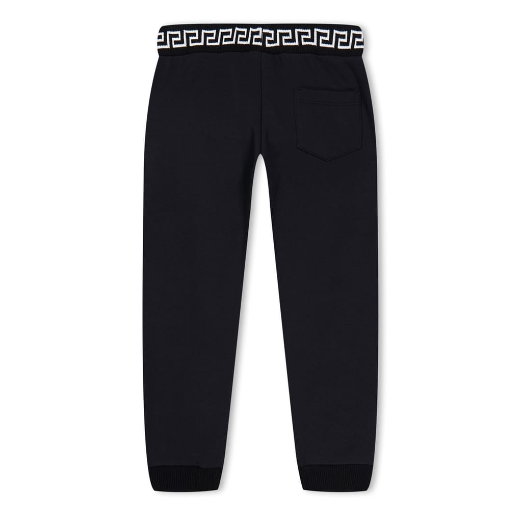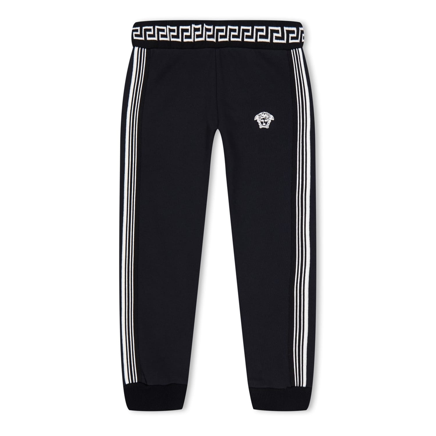 These Versace joggers for juniors feature a stylish stripe pattern with side stripes and a logo embellishment. Designed with a regular fit, they offer comfort and a modern look. The drawstring closure ensures a secure fit, making them a versatile addition to any casual collection. -
