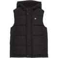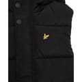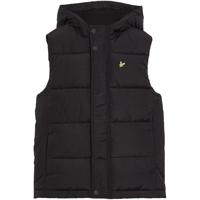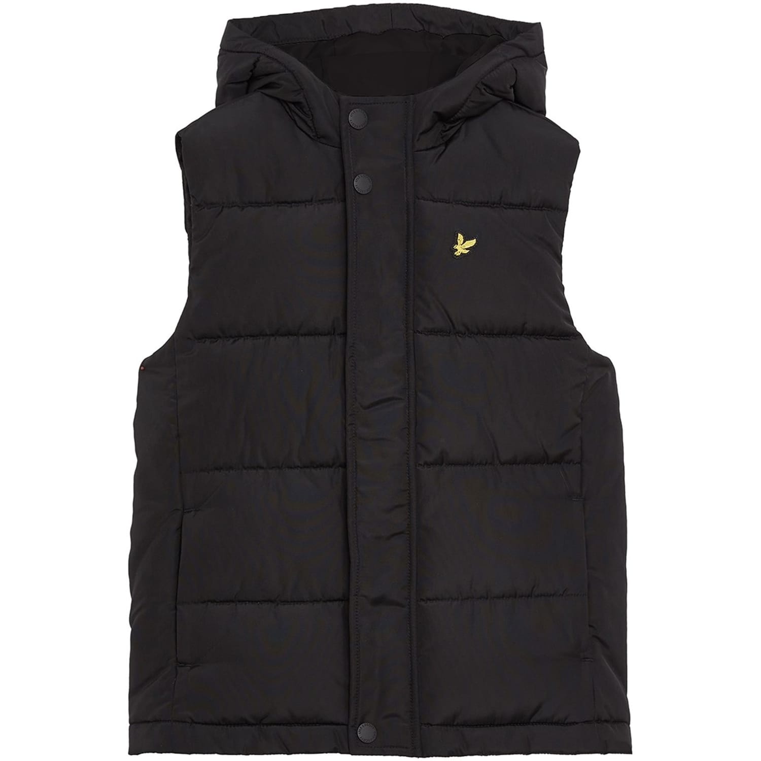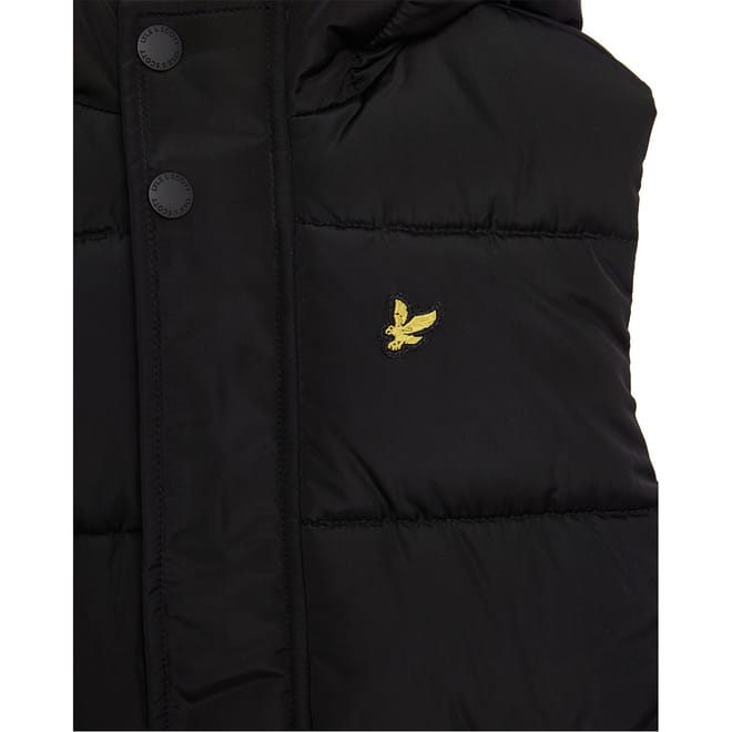The Lyle & Scott jacket combines a quilted, lightweight design with a hooded neckline for enhanced comfort. Featuring a snap button closure, this short, regular fit vest is perfect for layering. The solid pattern is complemented by an embroidered logo, adding a touch of distinction to this versatile piece. -