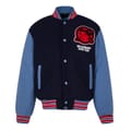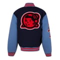 The Billionaire Boys Club varsity jacket for juniors features a ribbed crew neck and ribbed collar, offering a classic look. It has a snap closure and a regular fit, ensuring comfort and style. The jacket is adorned with logo patches and patch pockets, adding a distinctive touch. The ribbed hem and cuffs complete the design, while the solid pattern provides a sleek finish. -