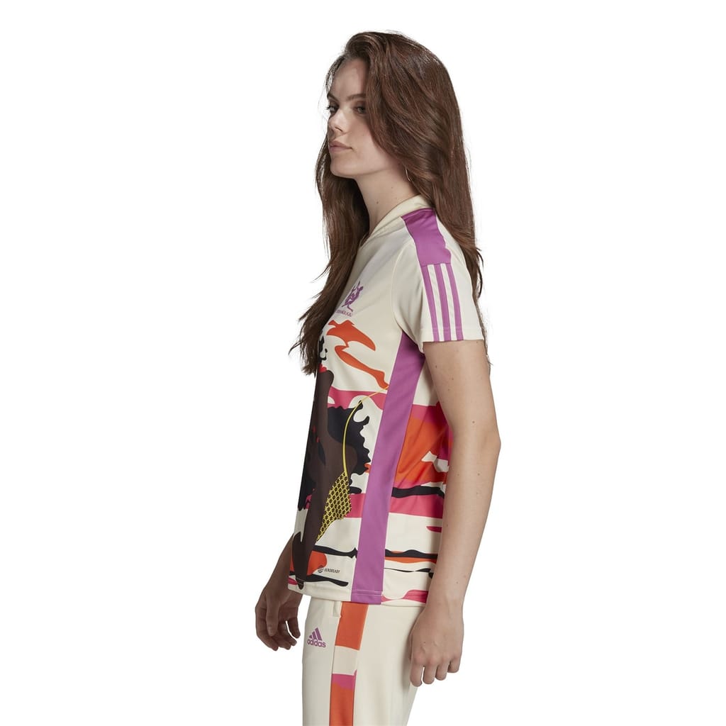 This Adidas Tiro t-shirt features a crew neck and short sleeves, perfect for performance activities. The regular fit ensures comfort, while the graphic print adds a stylish touch. The iconic logo embellishment completes this versatile piece, ideal for any active wardrobe. -
